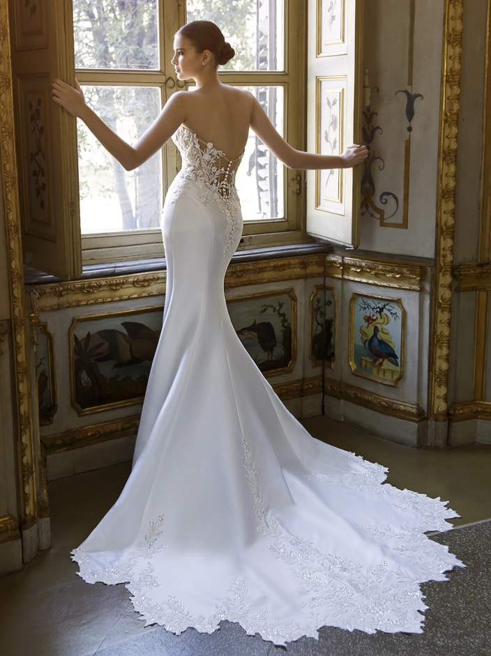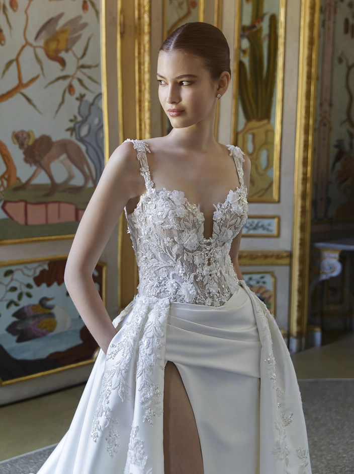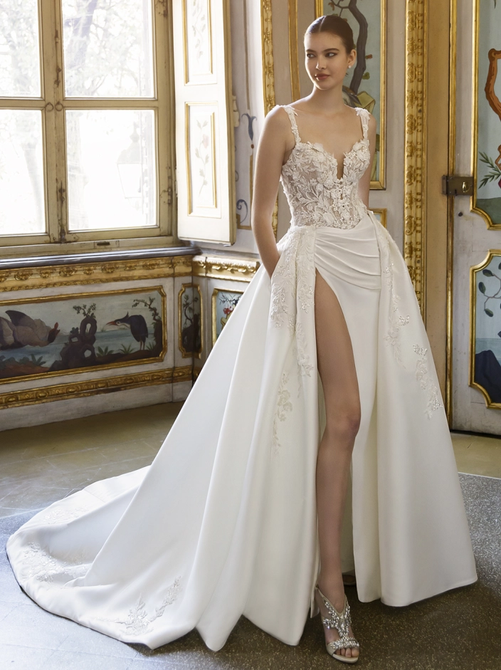DIVINA is here to sparkle with her radiant, multi-layered beaded floral and Chantilly lace bodice with delicate 3D floral motifs. This gown leaves us stunned with the glamorously dramatic and detachable ball gown overskirt (with pockets!) enhanced with additional sparkling beaded lace. Effortlessly remove the overskirt to reveal a sexy, draped column skirt with a stunning high slit and signature ÉLYSÉE sculpted train. A spectacular 2-in-1 look for your wedding day!