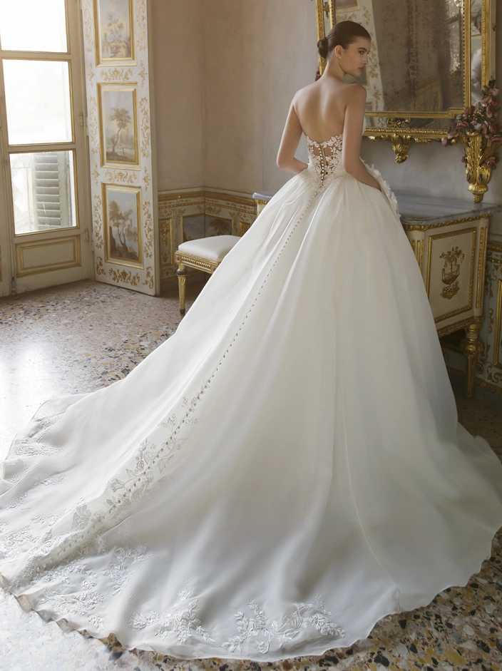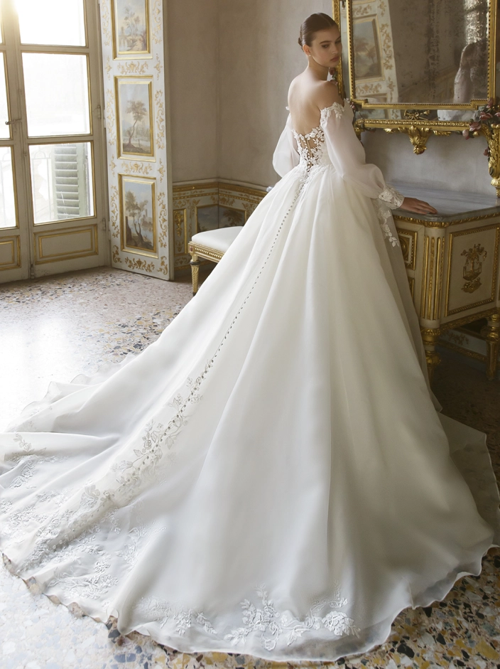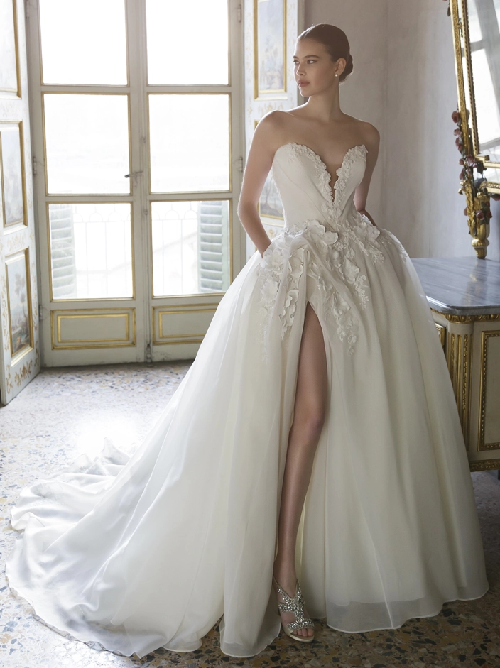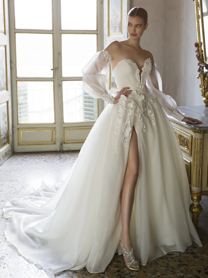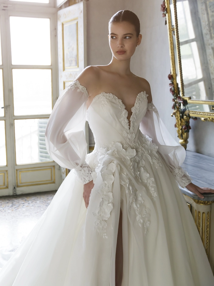 For all our ethereal brides, MONET presents sparkling floral embroidered lace along the elegant, sweetheart neckline draped bodice and enchanting 3D floral motifs cascading down into the dreamy tulle and sculpted organza ball gown skirt featuring a modern high slit – and pockets! To make this look even more ravishing, the sexy illusion corset back and detachable, off-shoulder organza blouson sleeves create the most captivating bridal look that will be sure to make all heads turn.