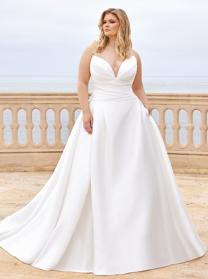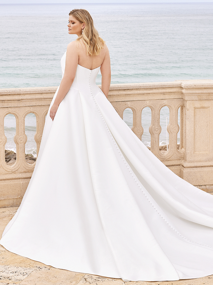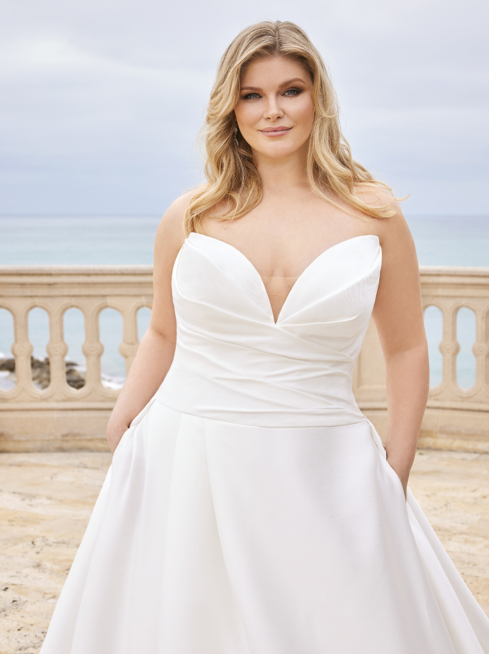 For our minimalist brides, BANCROFT x Édition is a classic Mikado ball gown with an alluring draped sweetheart neckline bodice with raised back bodice for support, elegant covered buttons trailing down the back to the hem, and a sexy skirt slit for the ultimate chic wedding look. And the cherry on top? This gorgeous gown is a wedding dress with pockets!