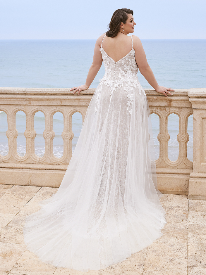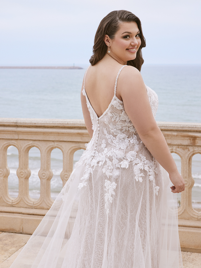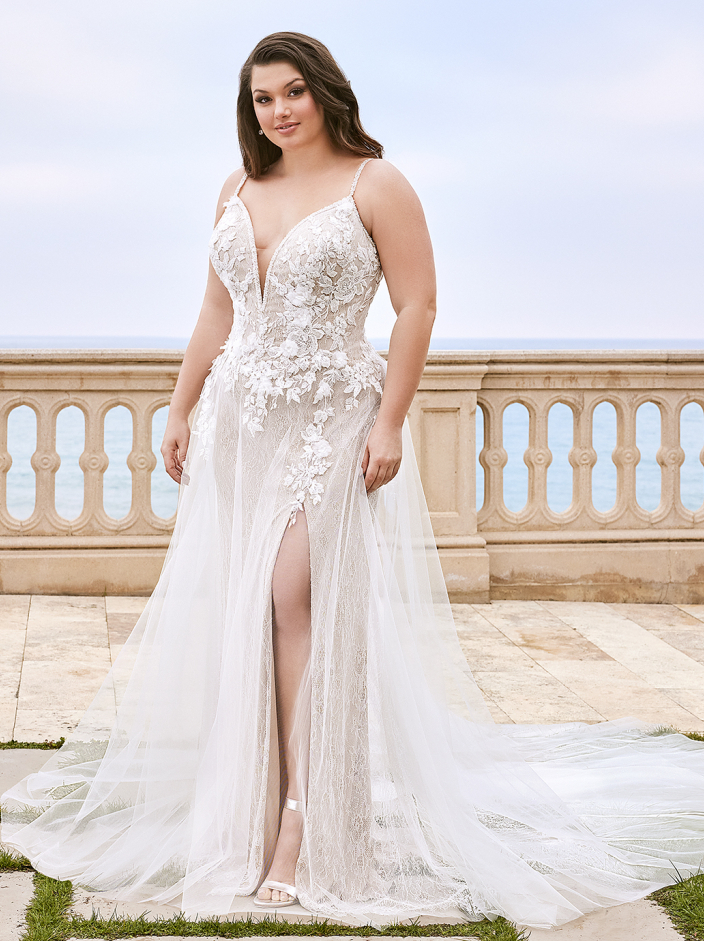 For brides who want an ultra-sparkly gown, GUINEVERE x Édition is here to make you shine! This dazzling A-line wedding dress features sparkling floral lace and 3D floral appliques on the bodice with a sexy V-neckline and delicate beaded straps. The intricate floral lace cascades down into the shimmery soft tulle outer layer over the Chantilly lace skirt with a high slit for the dreamiest look.