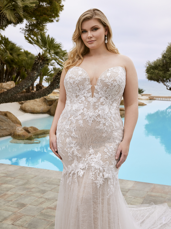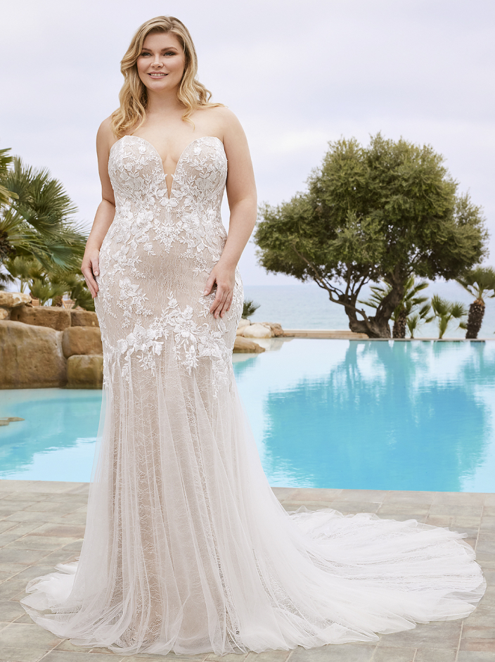 So much romance in one gown! TORI x Édition has us falling in love with her sparkling Chantilly and body-contouring embroidered floral lace on her delicate sweetheart neckline corset bodice. This gown is fitted through the knee before flowing down into a dreamy tulle and Chantilly lace train that will make everyone take a second look at this gorgeous gown!