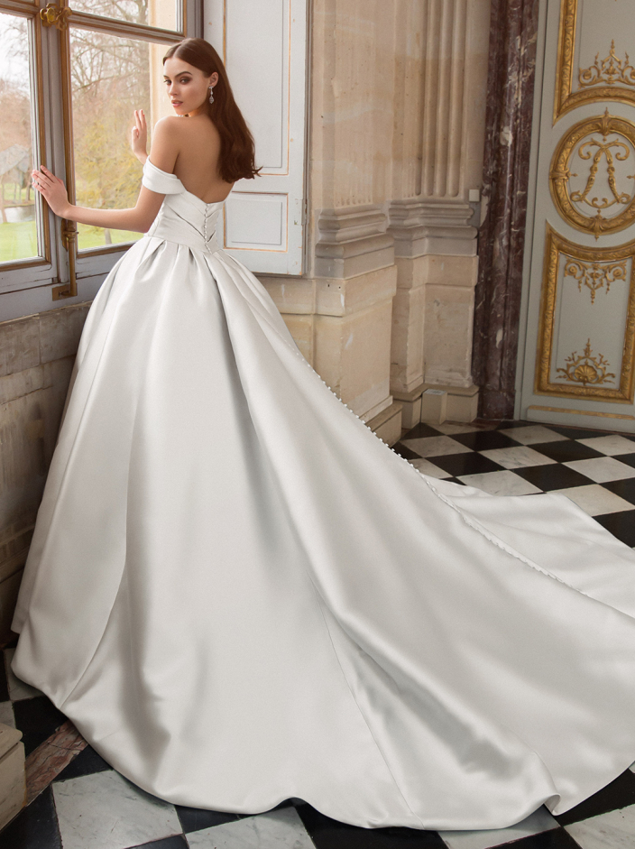 This ultra-fairytale gown is a timeless Mikado ball gown with an exquisite draped bodice and a sexy high slit for a super flattering look. The 3D floral appliques on the off-shoulder sleeves add extra charm and romance to this dream dress that would make even Cinderella jealous. And did we mention that ASTOR comes with pockets?