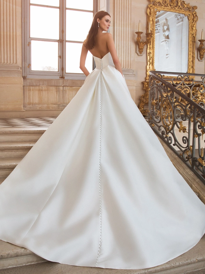For our minimalist brides, BANCROFT is a classic Mikado ball gown with an alluring draped sweetheart neckline bodice, elegant covered buttons trailing down the back to the hem, and a sexy skirt slit for the ultimate chic wedding look. And the cherry on top? This gorgeous gown is a wedding dress with pockets!