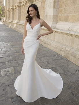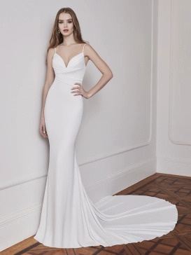BOUVIER is bringing the heat as a sleek and sultry crepe gown. This sophisticated, minimalist wedding dress showcases a sexy, deep illusion V-neckline, matching illusion side cut-outs, delicate spaghetti straps and a low back that will be sure to have heads turning as you walk down the aisle.