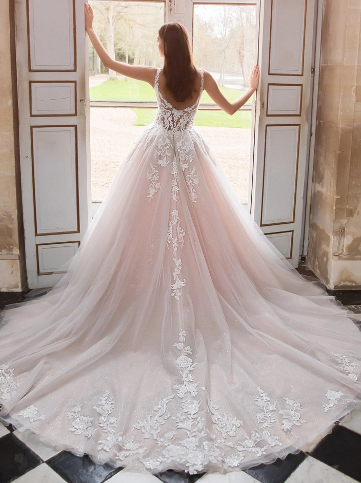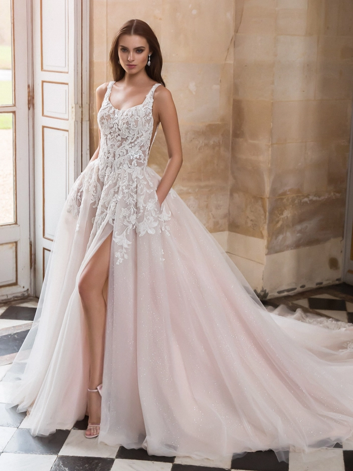 Calling all modern brides! ELIZABETH will be sure to make any bride look like a modern princess with her curved neckline bodice with lace straps to provide the perfect amount of support. This dramatic 18th century-inspired ball gown showcases a beautiful beaded baroque lace trickling down from the bodice to the sparkling tulle skirt with pockets. The illusion side cut-outs and high slit on the regal skirt add an extra sexy, sophisticated touch.