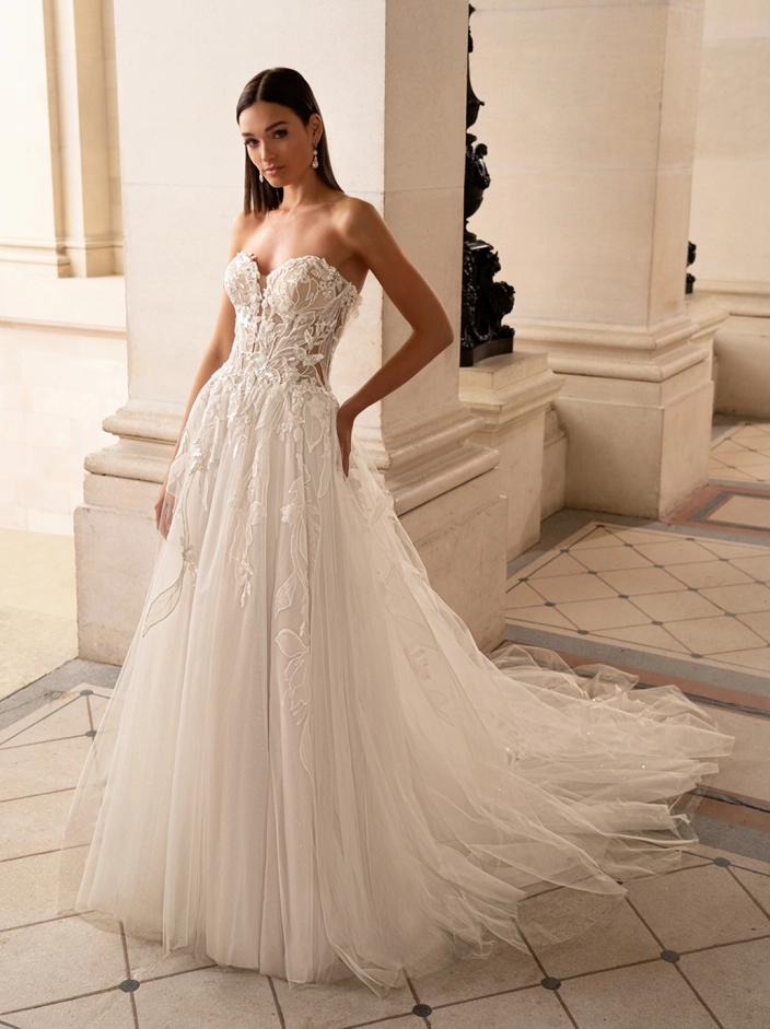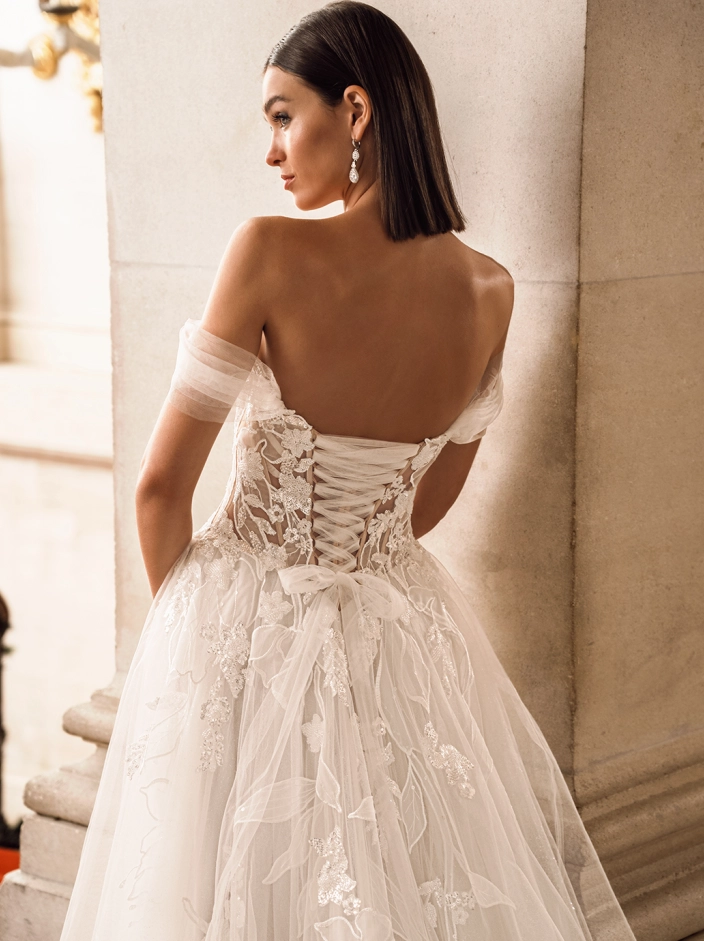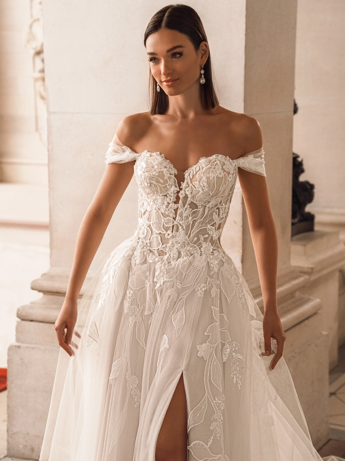 FAE is perfect for your fairytale wedding! This graceful A-line gown exudes an ethereal and romantic charm with its detachable off-the-shoulder straps, organza floral embroidered lace, and beaded floral appliques cascading from the bodice onto the soft, glittery tulle skirt with a sexy slit. The tulle corset back adds a touch of femininity and glamour to this beautiful gown.