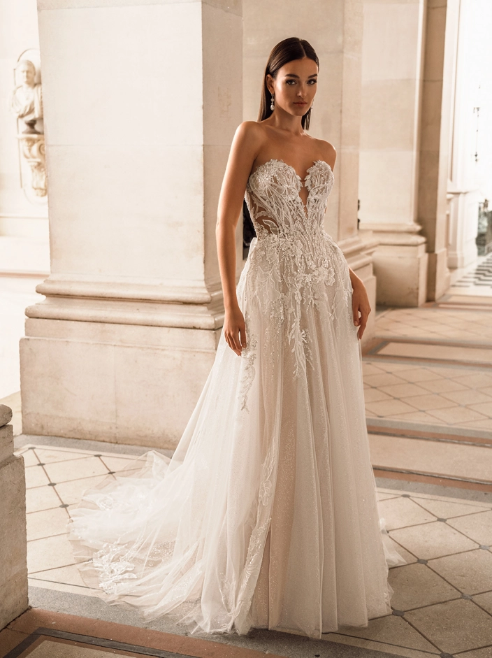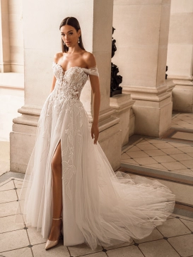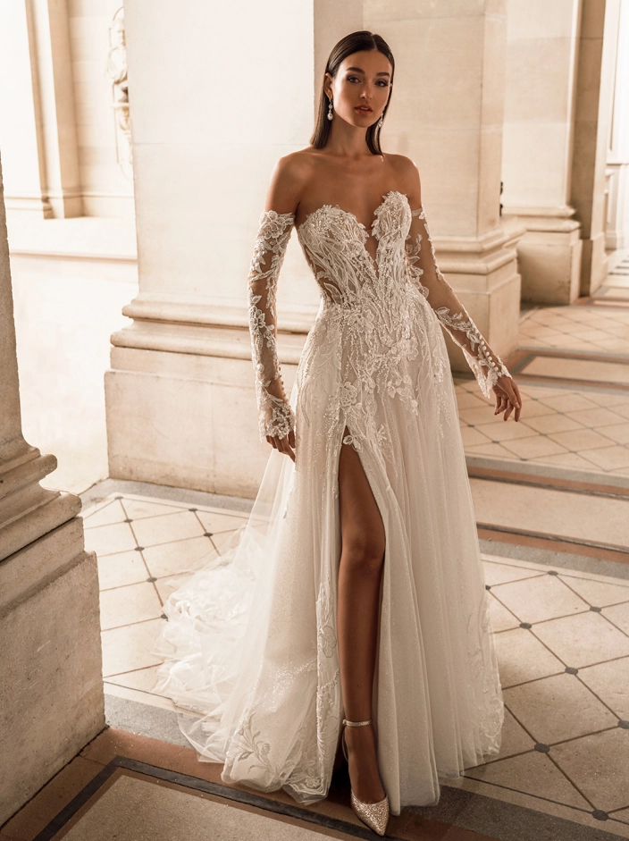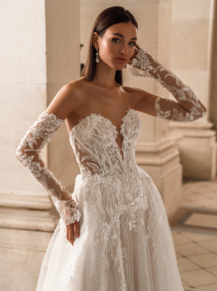 Calling all of our glitter queens! FAITH is here to sparkle up your special day. This shimmering A-line wedding dress features a mesmerizing bodice with striking geometric lace, organza floral embroidered lace, and beaded floral appliques along with matching elegant, detachable long sleeves. The dreamy tulle corset back adds a soft, ethereal element to the glamorous shine. The soft tulle and glitter tulle skirt also features a high slit for an ultra-romantic, sexy look.