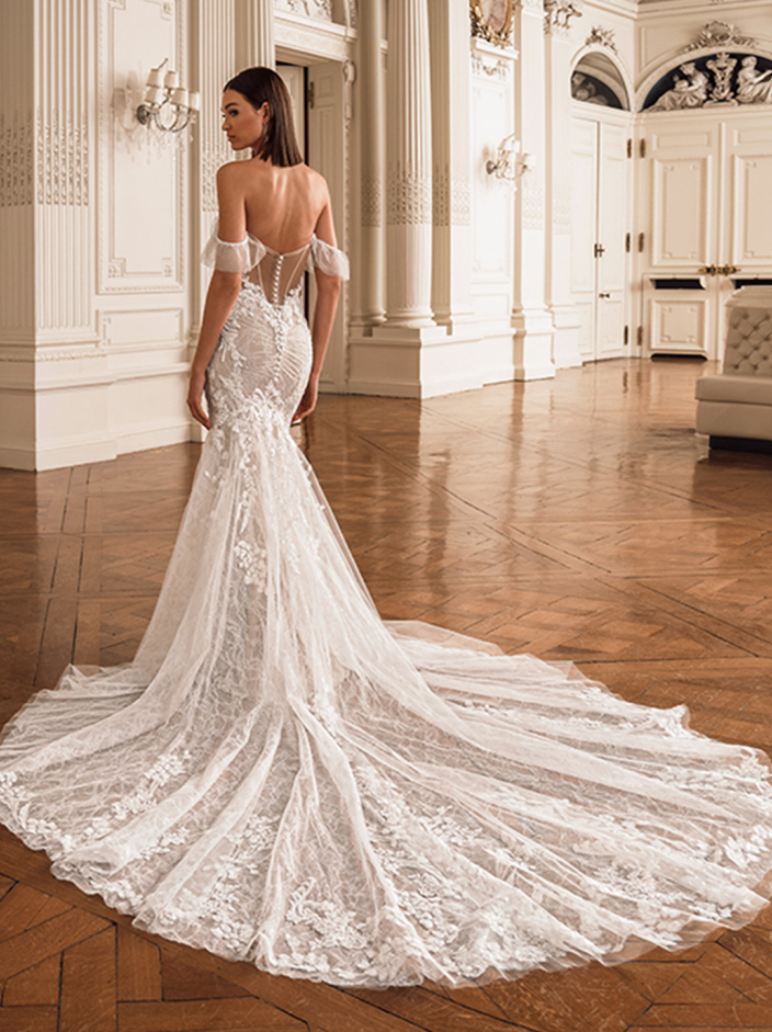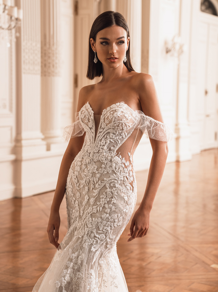 You can never go wrong with a sexy, all-over lace mermaid gown! FARRAH is the epitome of modern bridal beauty with its delicate 3D floral lace and timeless sweetheart neckline with charming ruffled tulle off-shoulder straps (which are also detachable!). The gown’s illusion side cut-outs provide the most elegant, figure-flattering look which will leave your wedding guests speechless.