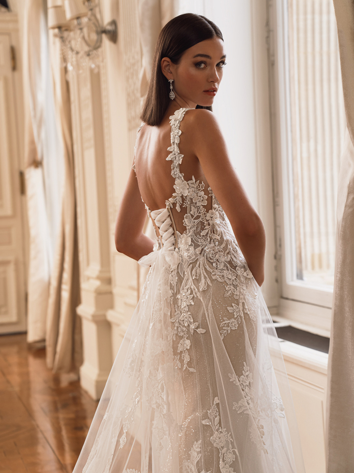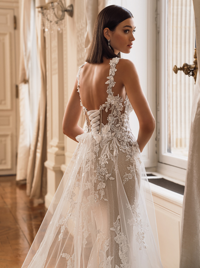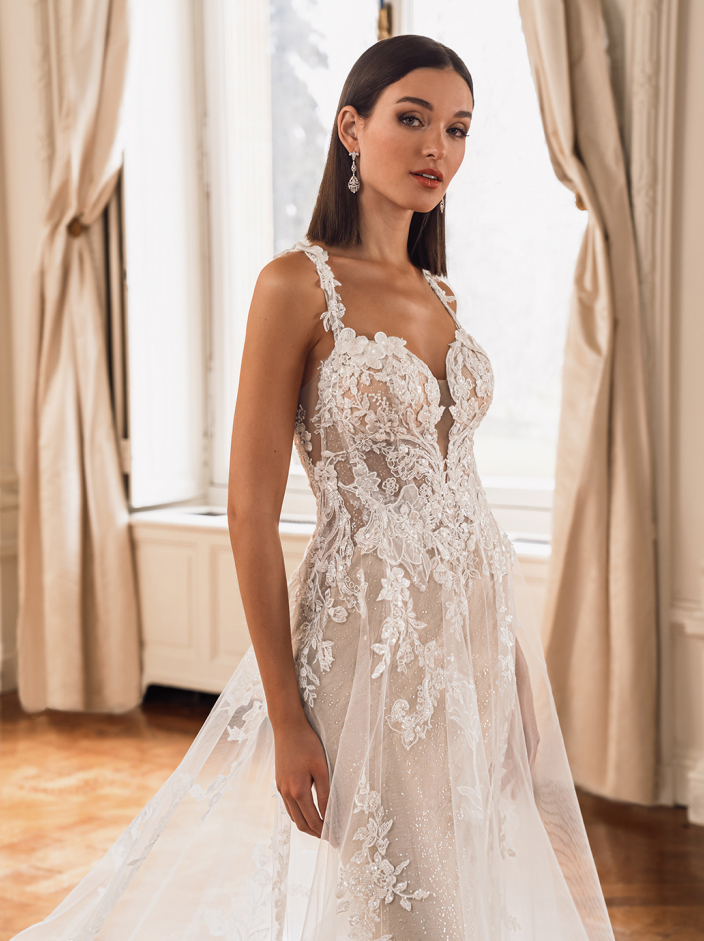 For our fairytale fantasy brides, FEMIE is the one for you! This ultra romantic wedding dress presents beaded 3D floral lace petals and beaded floral embroidered lace all over the bodice with exquisite beaded lace straps. The lace cascades down to a dreamy and dramatic tulle outer layer over a sparkling glitter tulle skirt for the most unforgettable, ethereal bridal look yet.