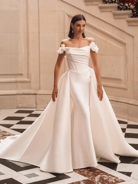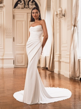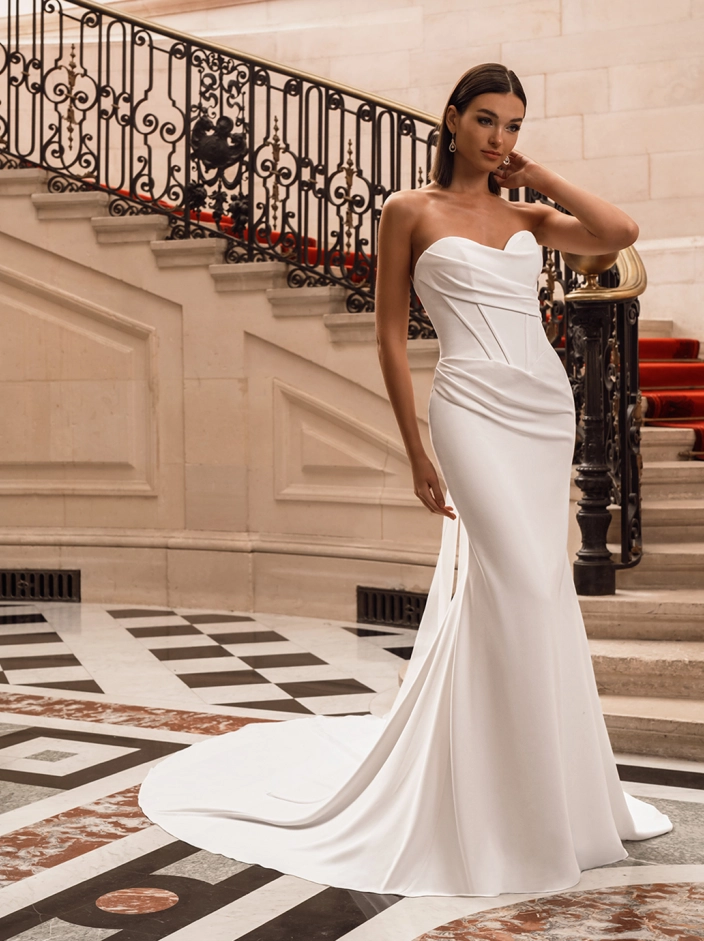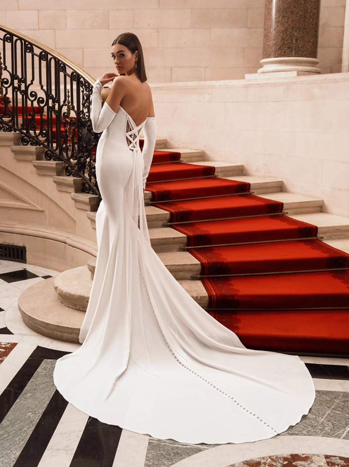 Bring out your inner goddess as you walk down the aisle in FIFI! This jaw-dropping chiffon and stretch georgette sheath gown features a stunning draped bodice with exposed corset boning and an eye-catching tulle corset back. The artful draping down to the sleek skirt paired with the matching long sleeves adds an extra dose of luxury to this modern bridal look.