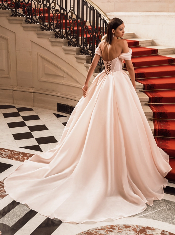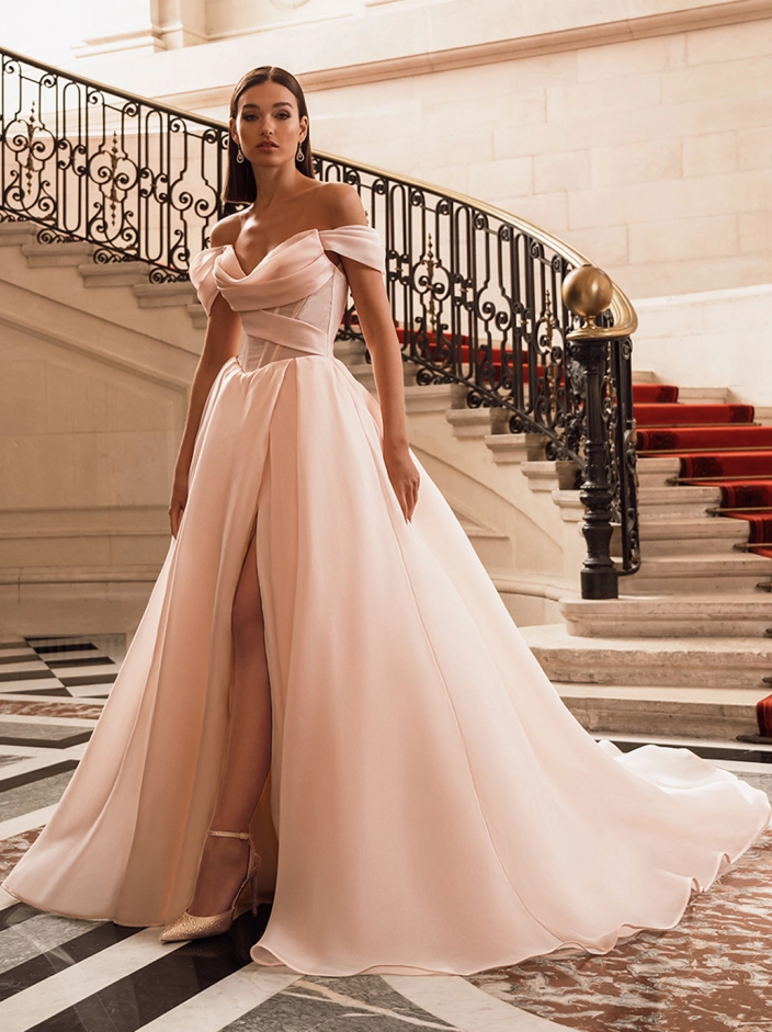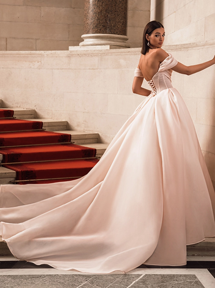 Pretty in pink! Stun your guests with a gorgeous blush organza ball gown look. FILIPPA showcases romantic draping all over the sweetheart neckline bodice with delicate detachable off-shoulder straps. The flattering basque waistline with the breathtaking skirt and high slit, along with the corset back with sweet bow detail make FILIPPA the most picture-perfect fairytale wedding dress.