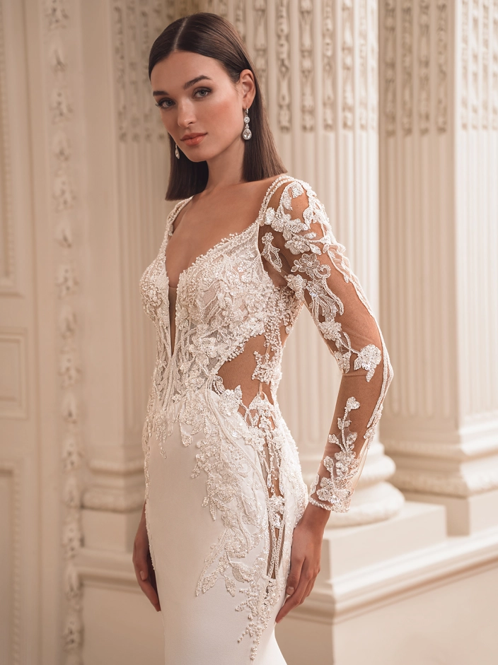 FLORA exudes sophistication and elegance with its beaded floral deep V-neckline and detachable long sleeves. The sparkling bodice with illusion side cut-outs gives this gown the perfect touch of sultry sophistication to the classic mermaid silhouette, making it the perfect choice for a modern bride.