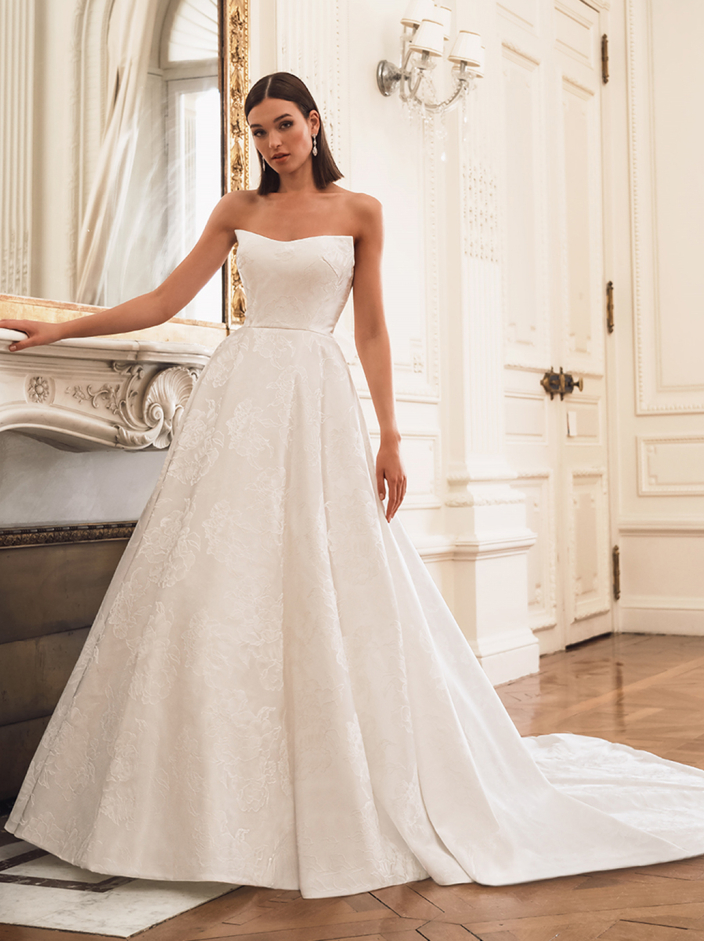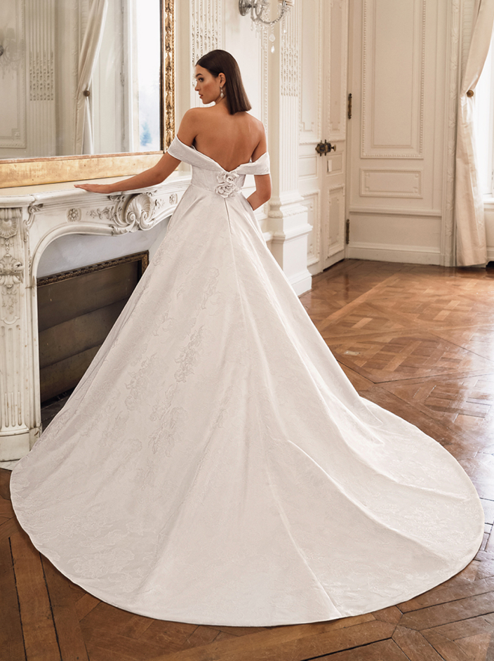 Featuring delicate, detachable off-shoulder straps and a romantic sweetheart neckline bodice, FREDERIQUE exudes modern fairytale chic with its jacquard ball gown skirt (with pockets!) and detachable floral corsage detail on the back. It’s a timelessly regal and romantic gown with a modern twist that will be sure to leave your wedding guests in awe.