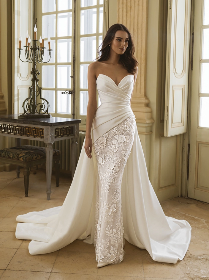 With its enchanting mix of fabrics and sculptural elements, the GABBY gown is ready to walk you down the aisle in style.