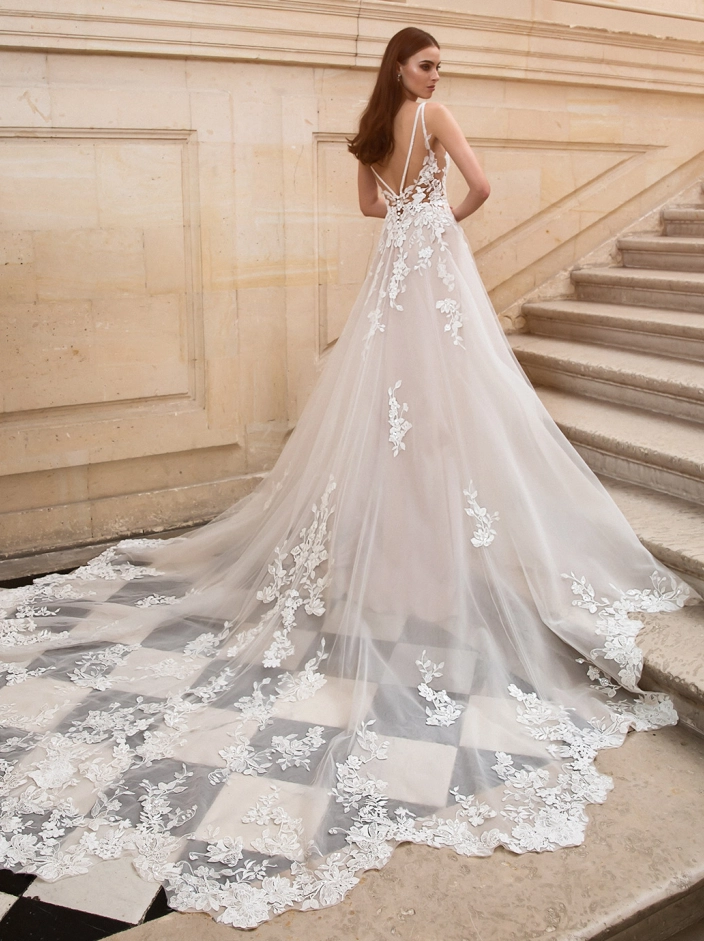 This ethereal A-line wedding dress features an exquisite, plunging V-neckline with delicate beaded straps that lightly shimmer on the shoulder and across the back. GAIA’s sweet sequined botanical lace on the bodice gorgeously trickles down onto the romantic tulle, sequin tulle and organza skirt with a sculpted train for the most enchanting look.