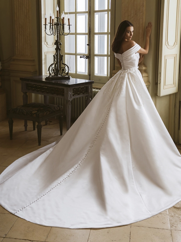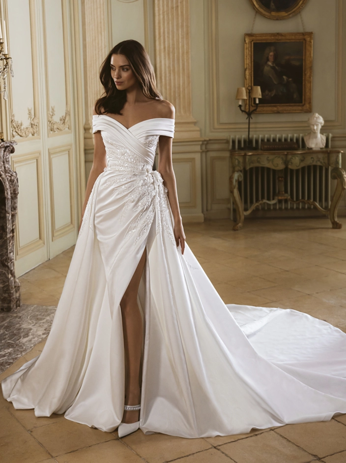 Experience pure enchantment in the GARNET wedding gown from the Élysée collection. This A-line masterpiece features ethereal 3D floral appliques dancing gracefully on satin, embodying Hollywood glam with a modern twist. The semi-sweetheart neckline adds a playful touch, while the high slit and detachable overskirt offer versatility for a bride who loves to make a statement. Channel your inner goddess in this sculptural gown that promises to captivate hearts at every turn.