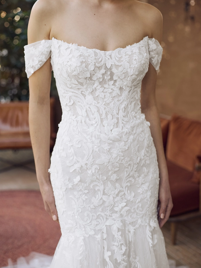 Introducing the ethereal GEORGIA wedding gown from the Élysée collection -- a romantic fit & flare silhouette adorned with intricate 3D floral appliques and luxurious baroque lace. The gown features a dreamy scoop neckline and captivating detailing with detachable off-shoulder straps for a playful touch.