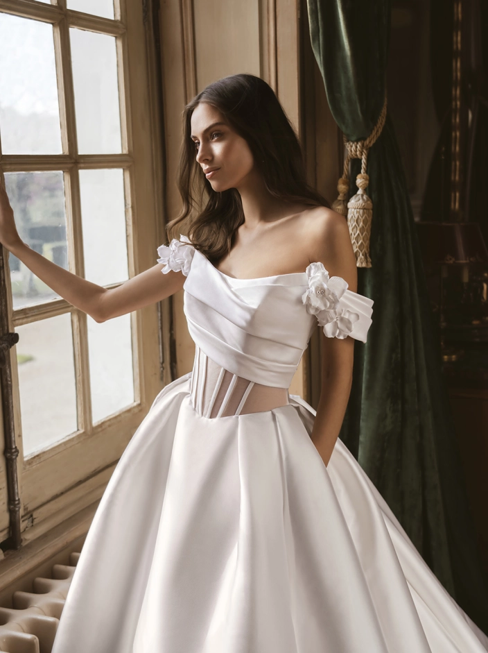 Introducing the ethereal GWENDOLYN ballgown from the enchanting Élysée collection! Crafted from luxurious mikado or satin, this princess-style dress boasts a dreamy silhouette fit for a fairytale wedding. The scoop neckline adds a touch of modern elegance, while the playful addition of pockets and 3D flowers brings a whimsical, sculptural element to the design.