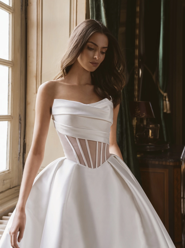 As you glide down the aisle in the GWENDOLYN wedding gown, feel like the true royalty you are, enveloped in a vision of romance and sophistication. Are you ready to let this gown's magical charm be part of your special day?