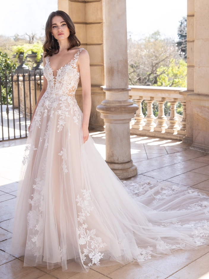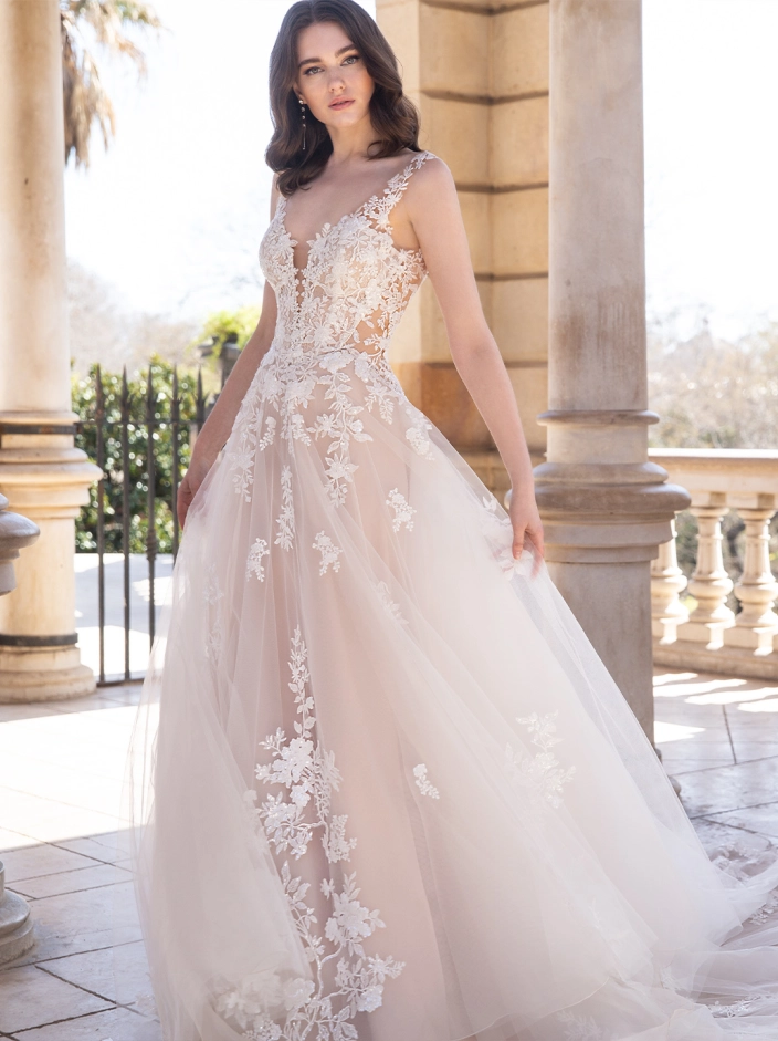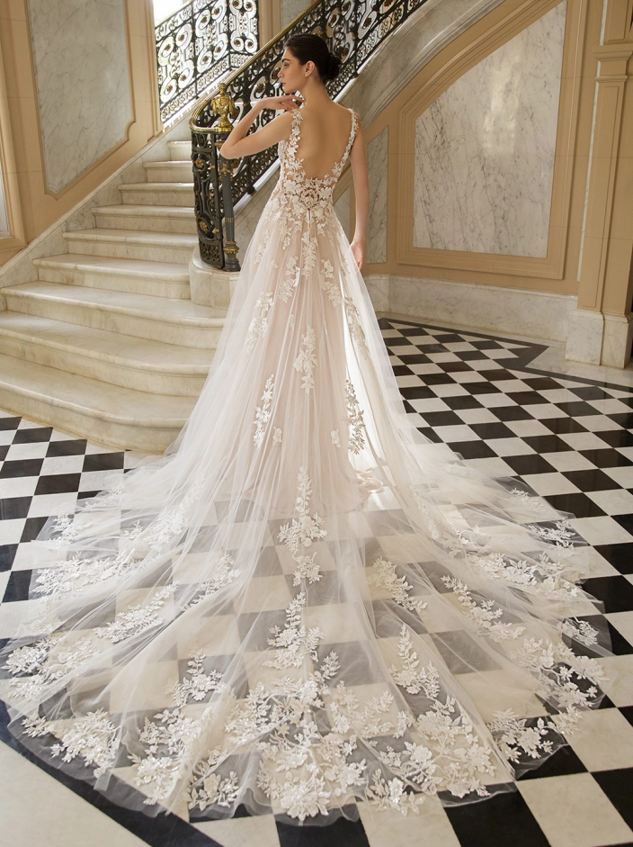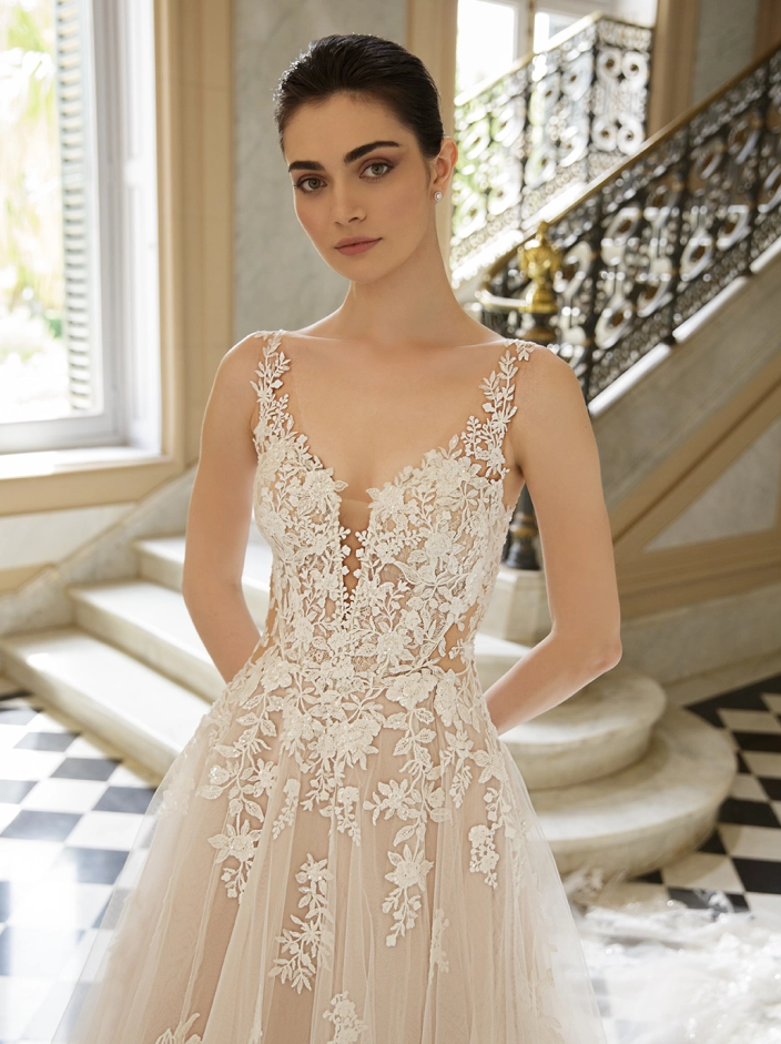 Picture-perfect modern romance. This slim, soft A-line gown features sparkling organic floral lace and spectacular hand-beading at the neckline. Unique side cutouts create a body-contouring shape to balance out the ethereal, flowing skirt that manages to stay light and airy.