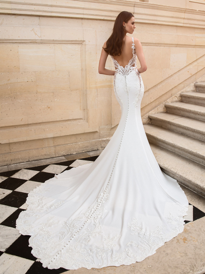 An inspiring new take of a classic crepe silhouette gown showcases a sexy, plunging V-neckline with sparkling illusion lace trickling down into modern, sexy body-contouring lace cut-outs at the front and back skirt to really carve out the bride’s silhouette. LOREN will stun your guests as you walk down the aisle and show off that divine illusion lace low back.