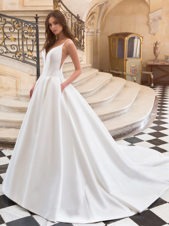 Make a grand entrance with this Mikado dream! This glamorous ball gown has a daring illusion V-neckline as well as illusion V-side cut-outs to match the breathtaking low back accentuated with elegant straps. MIRREN provides a sculpted bodice to cinch the waist and flatter the figure while providing the perfect amount of support. And… she also comes with pockets!