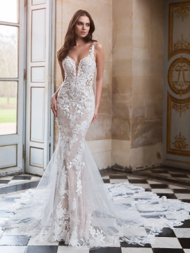 Sophisticated and sexy NEYTIRI showcases multiple layers of contouring, fully beaded lace motifs over sparkling Chantilly lace and tulle. This fully sparkling mermaid gown features a modern sculpted high neckline and modern thick lace straps that are balanced with its deep sexy side cut-outs. NEYTIRI will be sure to dazzle at every turn!
