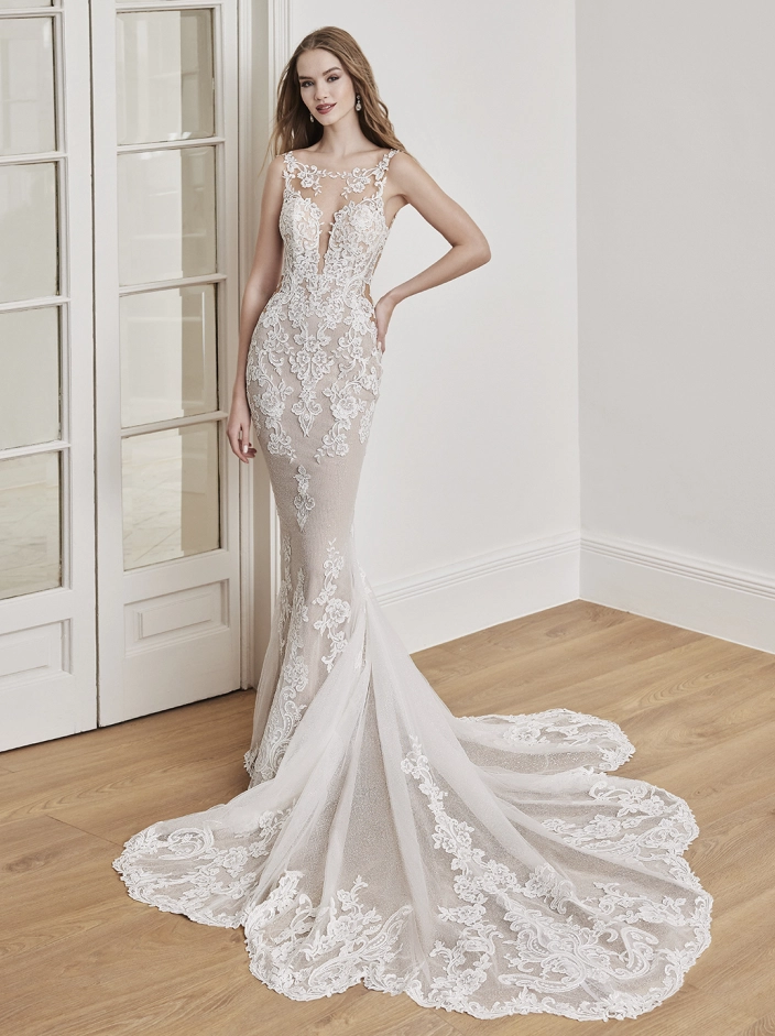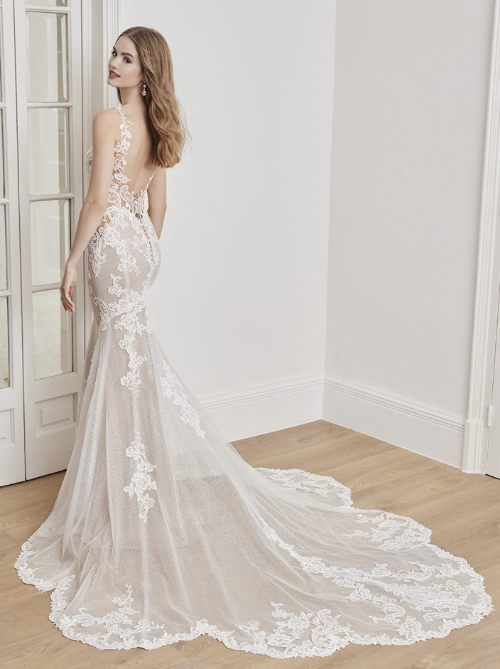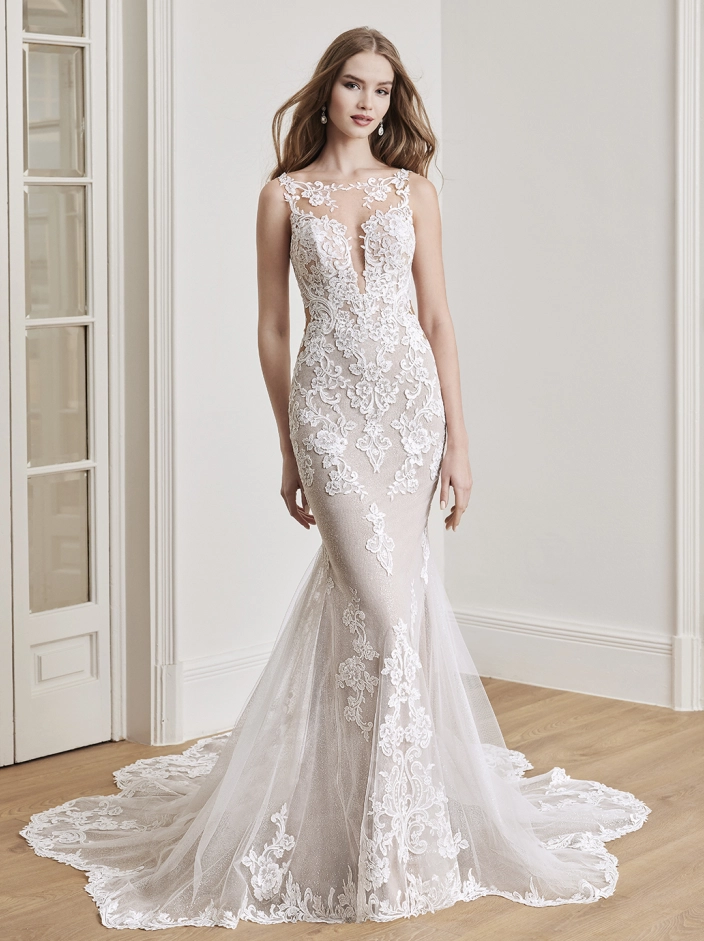 Sweet and romantic, ADAIR is the epitome of sophistication with her high illusion neckline and corded floral lace from the bodice down to the glittery tulle skirt. This sparkly gown features illusion side cut-outs to accentuate the waist for a snatched look, while the shimmering sculpted train will be sure to catch everyone’s eyes.