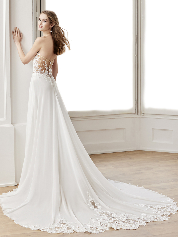 A soft and flirty look for your wedding day! AERIN features a classic draped sweetheart neckline with illusion lace side cut-outs leading to a gorgeous exposed illusion corset back. The flowy chiffon skirt presents a bow belt on the waist to give a sweet and delicate touch, as well as a high slit for an added dose of subtle sexiness. It is the perfect destination wedding dress!