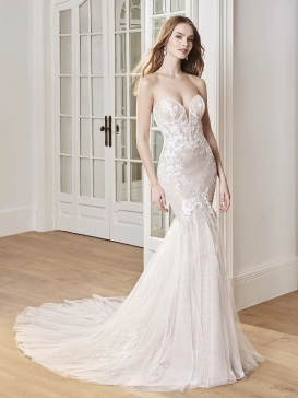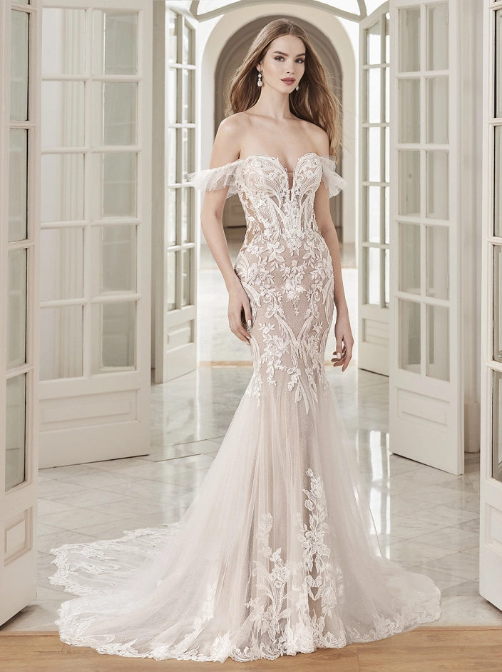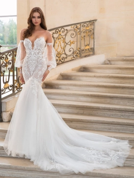 This captivating mermaid wedding dress showcases everything we want in a gown and more! CHEYENNE is enhanced with multiple layers of beaded baroque and floral lace over full sparkling tulle and detachable flirty off-the-shoulder ruffle sleeves for an ultra-romantic, flirty look. The sparkling embroidered lace and illusion side cut-outs are sure to flatter the figure alongside the sparkly tulle skirt that trails down into a stunning sculpted train.