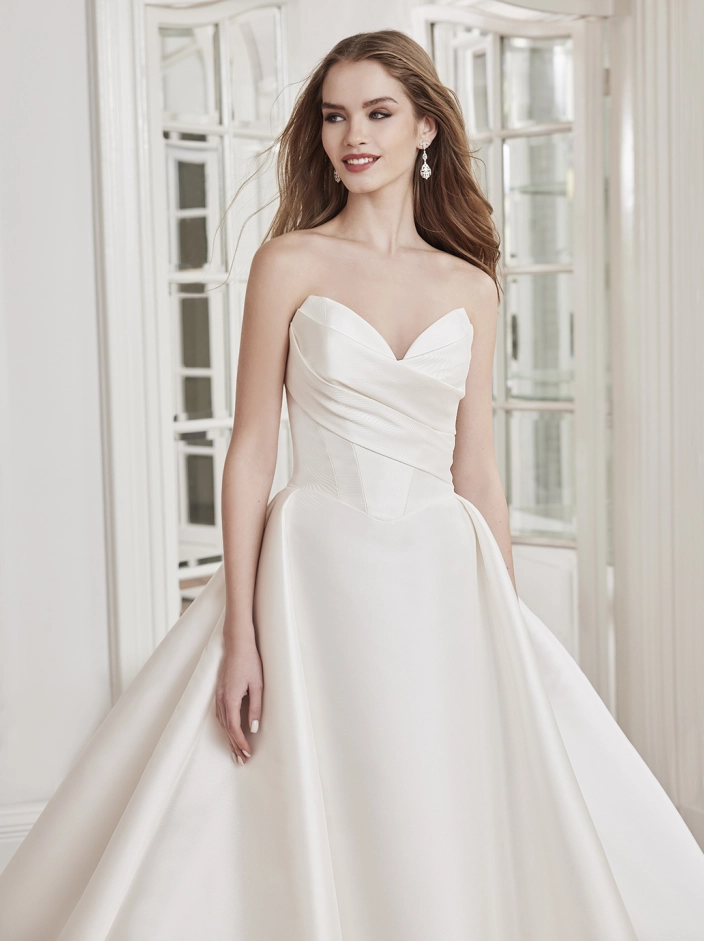 A timeless beauty we can’t help but fall in love with! This Mikado wedding dress presents a divine draped corset bodice with a Basque waistline to make this A-line gown an even more flattering look with its sleek skirt with sexy high slit.
