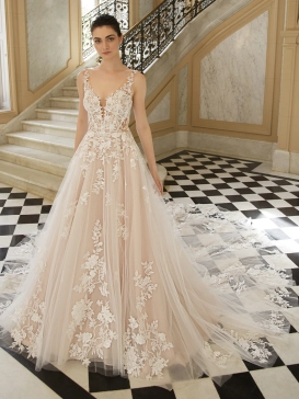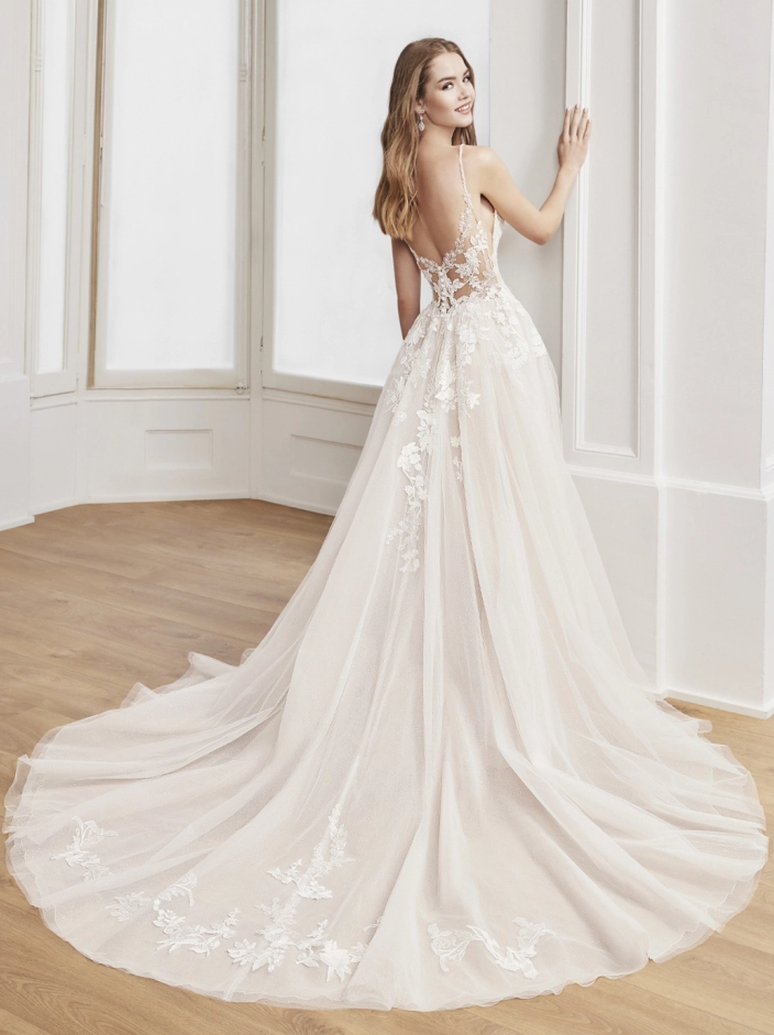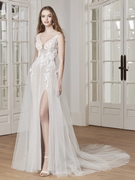 The most ethereal look yet! This shimmering A-line gown features sparkly embroidered lace that cascades down to the glittery tulle and organza skirt with a sexy high slit. The illusion lace back has us all falling in love with DAKOTA.