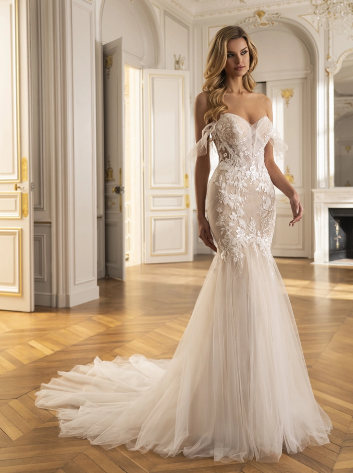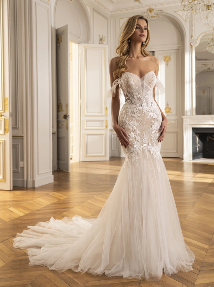 Adorned with delicate beaded floral embroidered lace and botanical lace, ELLIANA embodies chic glamour with its criss-cross tulle sweetheart neckline bodice and soft tulle mermaid skirt. The delicate, detachable off-shoulder tulle straps and tulle corset back add an extra touch of flirtiness to this beautiful bridal look.