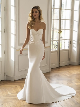 Effortlessly elegant, ERIN features a draped, squared neckline with peek-a-boo beaded Chantilly lace and clean lines, creating a look that is both minimalist and eye-catching. This sleek and chic stretch georgette sheath gown also showcases a stunning skirt slit with beaded lace overlay for an extra dose of sexy sophistication.