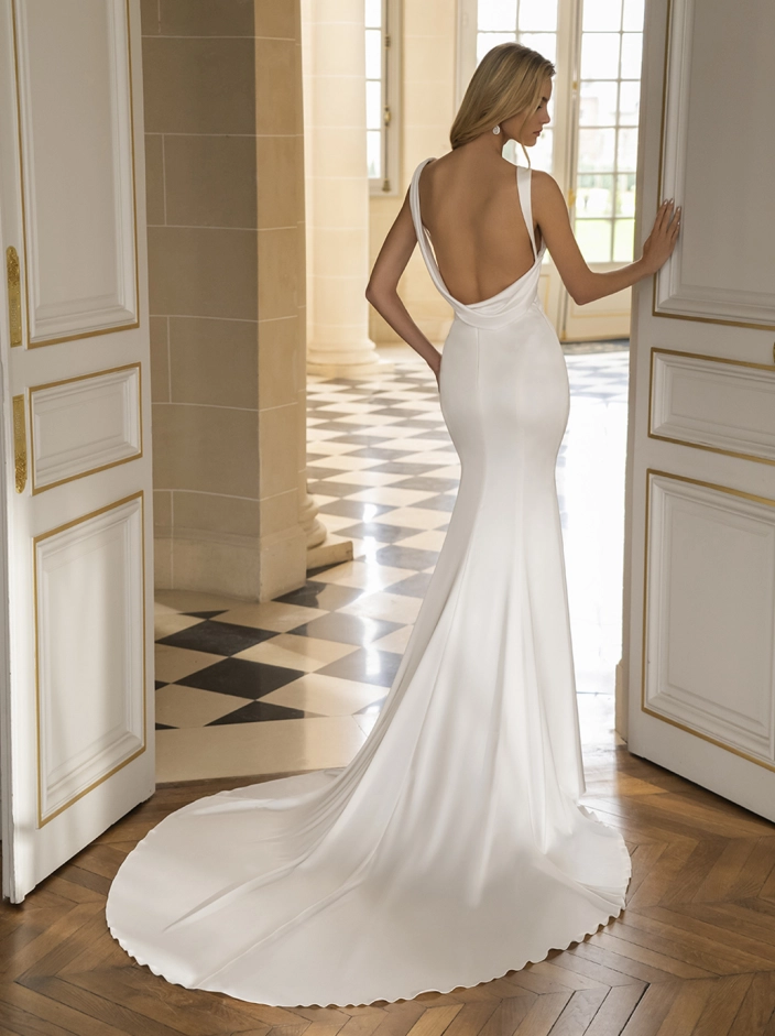 With its minimalist design and subtle detailing, EVA offers a fresh and modern take on classic bridal style with its luxurious satin fabric and draped bodice, ensuring that you’ll look and feel radiant on your special day. Your wedding guests’ jaws will be on the floor after seeing the sexy plunging low back with draped cowl detail that gives ultimate ethereal goddess vibes.