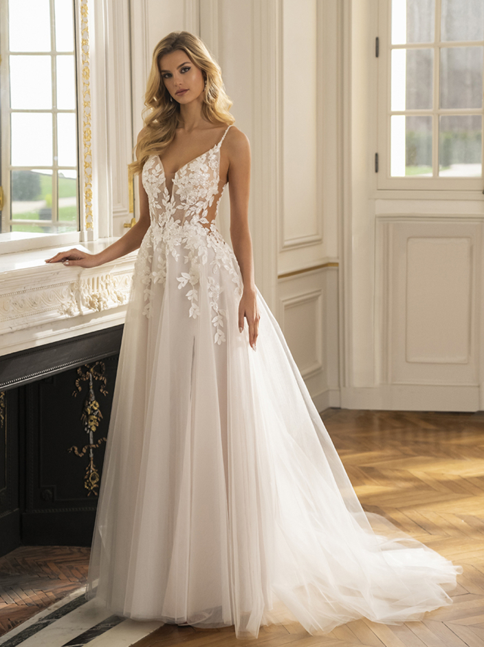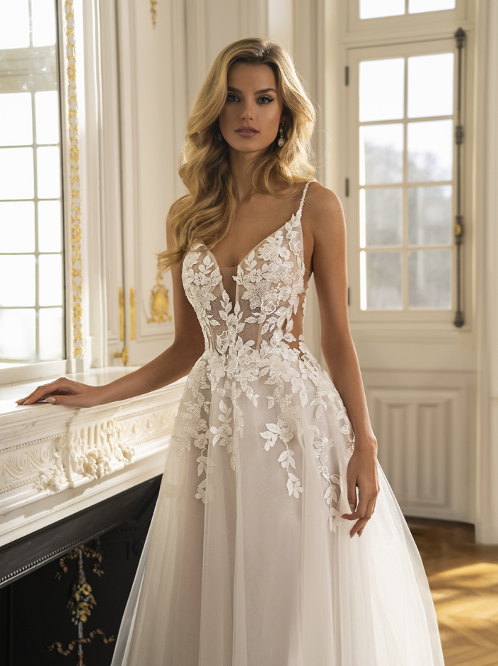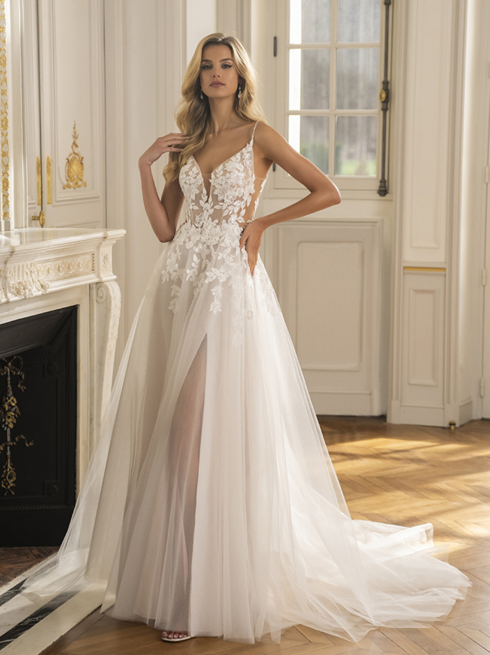 Soft and romantic, EVANKA is a classic A-line gown with a modern twist – figure-flattering, sexy side cut-outs adorn the sweet V-neckline bodice with 3D floral appliques and beaded floral lace. With a dreamy, sparkling A-line skirt and high-slit peeking out beneath a soft tulle overlay, this bridal style is guaranteed to impress.