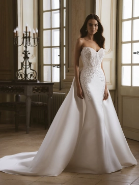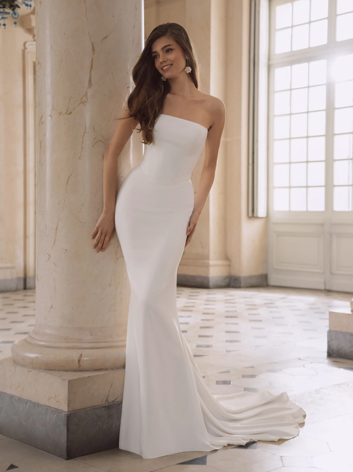Introducing the ethereal FERN wedding gown from the Étoile collection. Crafted with stretch georgette and delicate tulle, this A-line silhouette is a dreamy choice for the modern romantic bride. The minimalist design is elevated by a straight neckline and captivating 3D flower detailing, while the unique 2-in-1 feature adds a playful touch.
