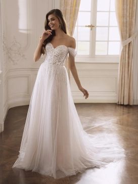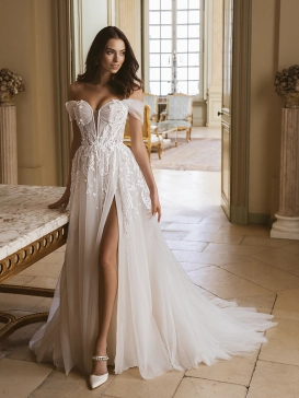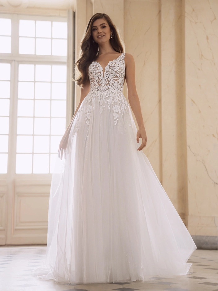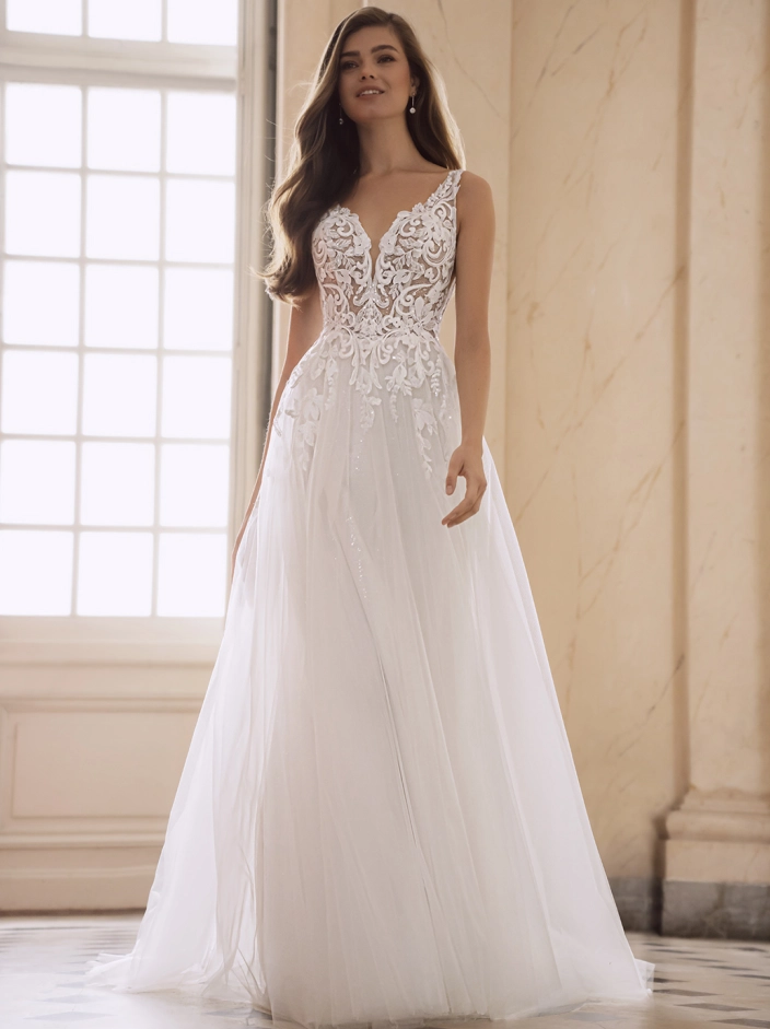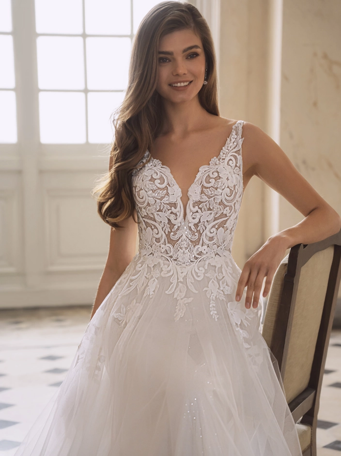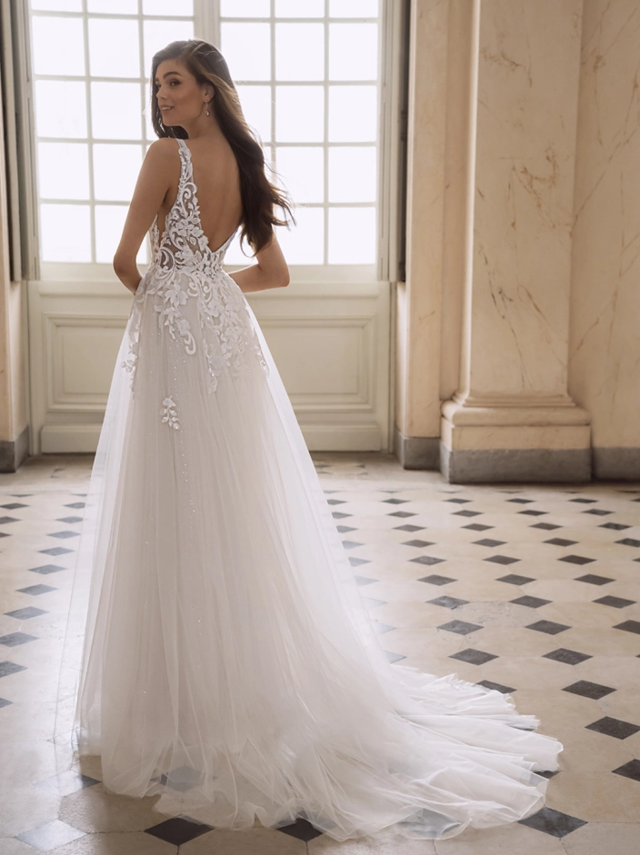 Introducing the ethereal FONDA bridal gown from the enchanting Étoile collection. Crafted from luxurious baroque lace and dreamy tulle, this A-line silhouette exudes a romantic and whimsical charm. The gown features a mesmerizing backless design that adds a touch of allure, perfectly complemented by a graceful v-neck neckline.