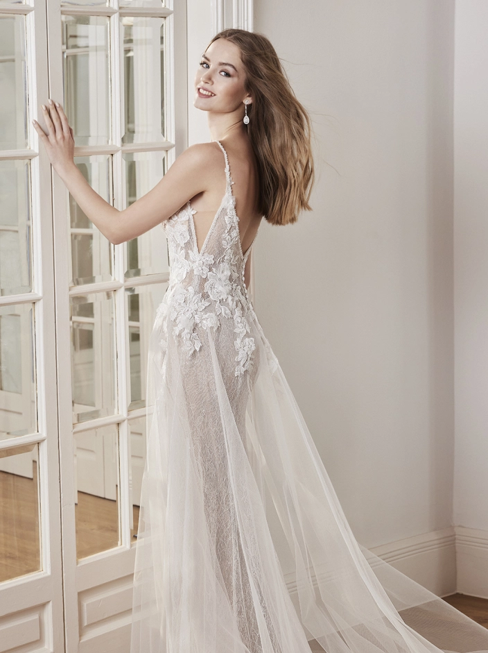 For brides who want an ultra-sparkly gown, GUINEVERE is here to make you shine! This dazzling A-line wedding dress features sparkling floral lace and 3D floral appliques on the bodice with a V-neckline and delicate beaded straps. The intricate floral lace cascades down into the shimmery soft tulle outer layer over the Chantilly lace skirt with a high slit for the dreamiest look.