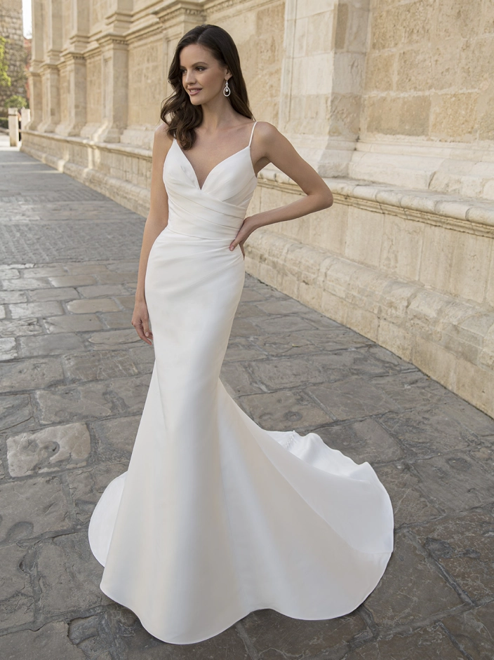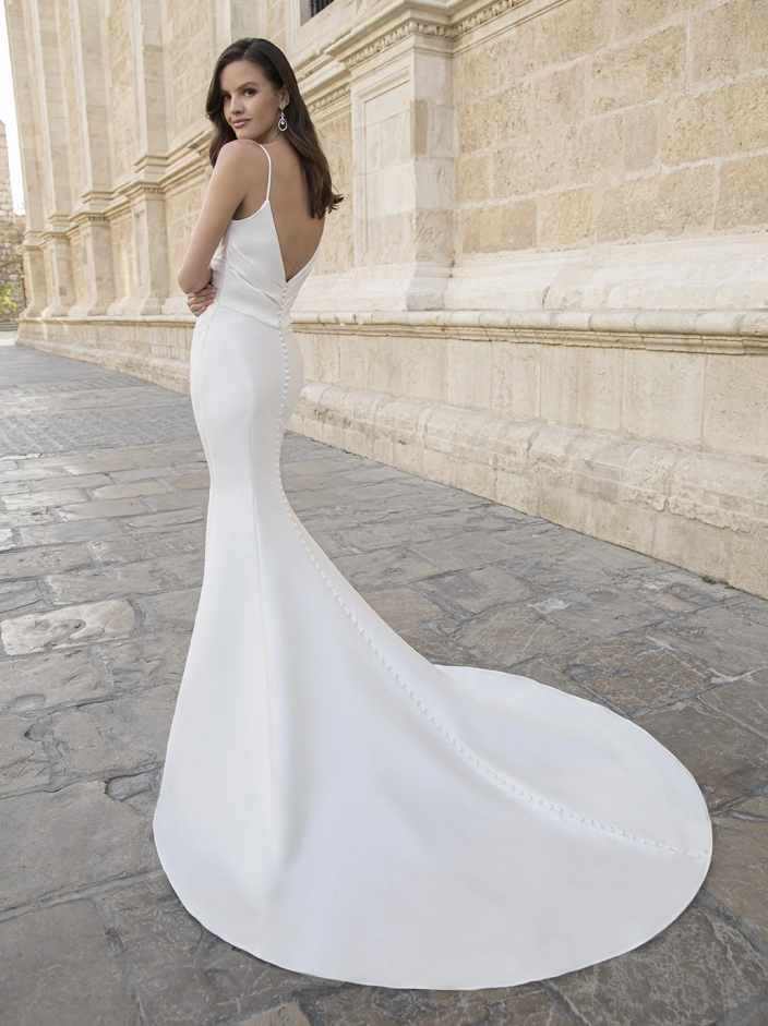 For all our gorgeous minimalist brides, MARILYN is a picture-perfect, modern mermaid wedding dress. This figure-flattering Mikado gown features a clean side-draped bodice with delicate spaghetti straps for a sophisticated, glamorous look. The sleek skirt is subtly layered for a light and flowy feel, cascading down into a chic, classic train with sweet buttons trailing down to the hem.