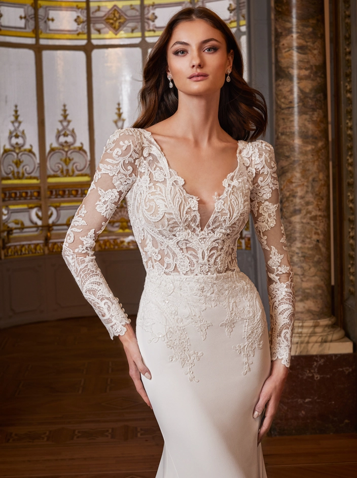 Evoking a sense of romance and refined sophistication, ELAINE features intricate corded floral lace and sparkling baroque lace cascading from the V-neckline bodice down to the smooth and luxurious stretch georgette skirt with a jaw-dropping sculpted train. The detachable, long lace sleeves and low back add a modern touch while the fitted silhouette flatters the figure, making it the perfect choice for the bride who desires a timeless yet contemporary bridal look.