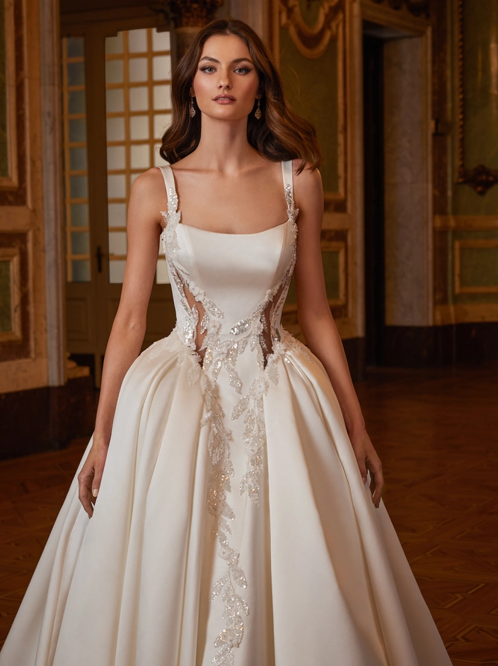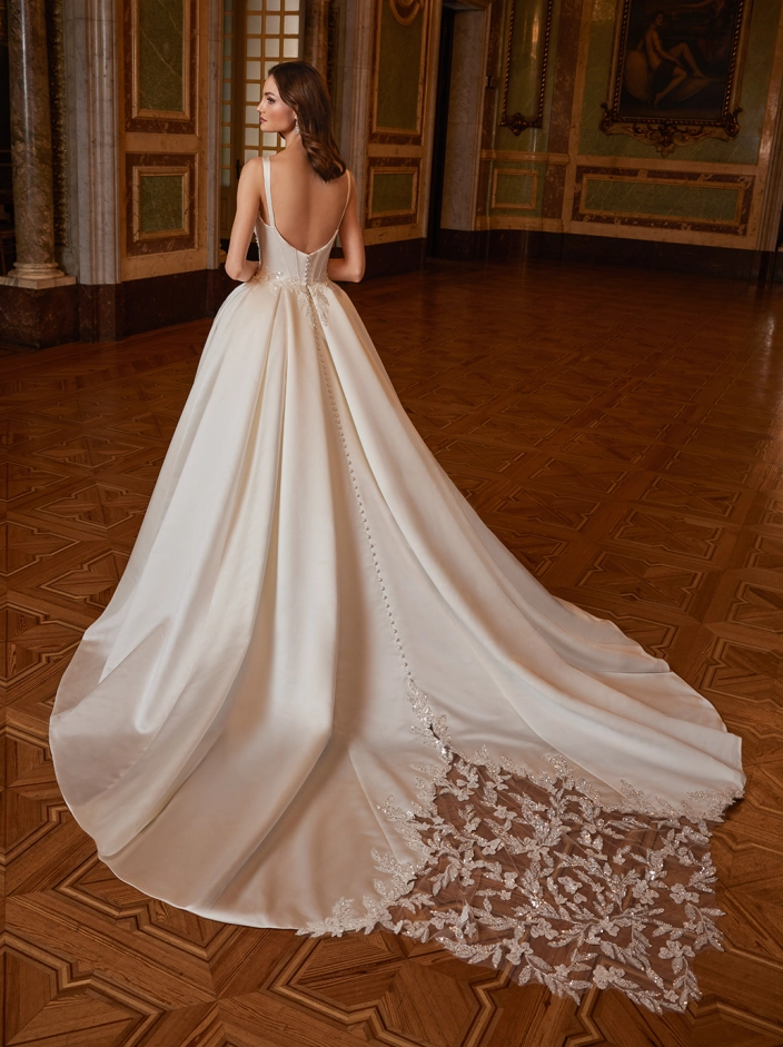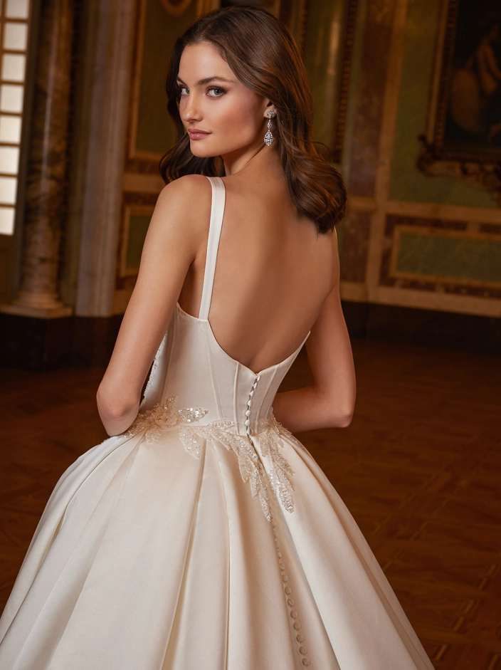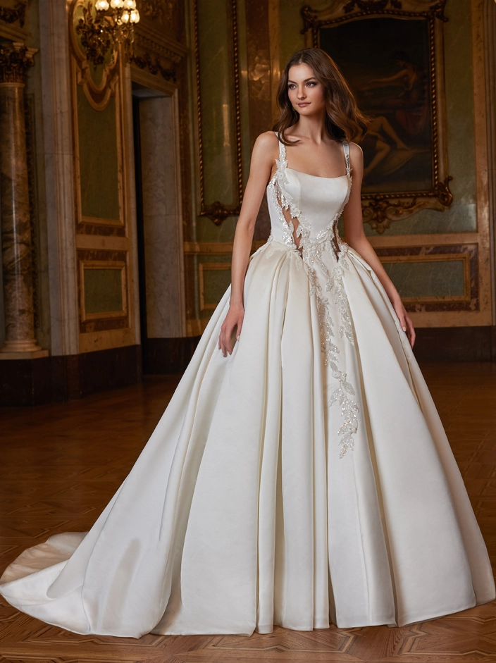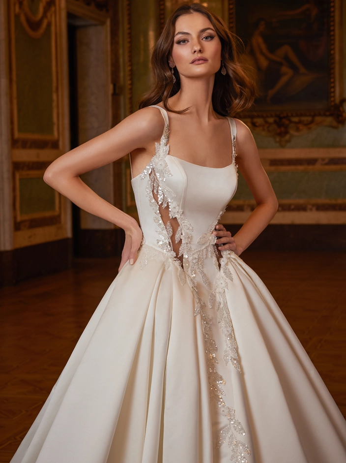 Radiating with so much charm and modern beauty, ELSIE showcases a flattering squared neckline and fitted bodice with dazzling beaded lace contouring cut-outs that accentuates the curves before flowing into the most full, grand ball gown skirt. The subtle shimmer of the lace cascading down from the basque waistline to the dramatic box pleated skirt with sparkling lace sculpted train will be sure to make a statement for your gorgeous walk down the aisle.