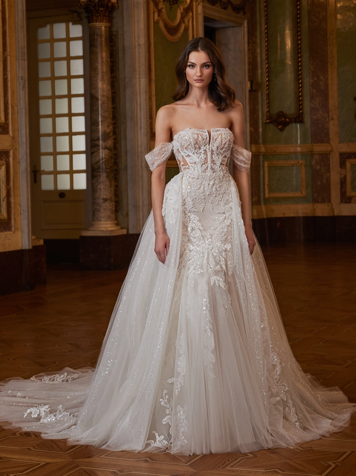 Boasting a romantic sparkling lace bodice with detachable off-shoulder straps, EMILIA exudes princess-worthy charm and feminine allure. The enchanting, detachable ball gown overskirt can be removed to reveal a stunning, figure-flattering mermaid silhouette hiding beneath. Beaded lace and floral embroidered lace detailing adds a touch of glamour, while the illusion back ensures a flattering fit, allowing the bride to feel like royalty as she walks down the aisle.