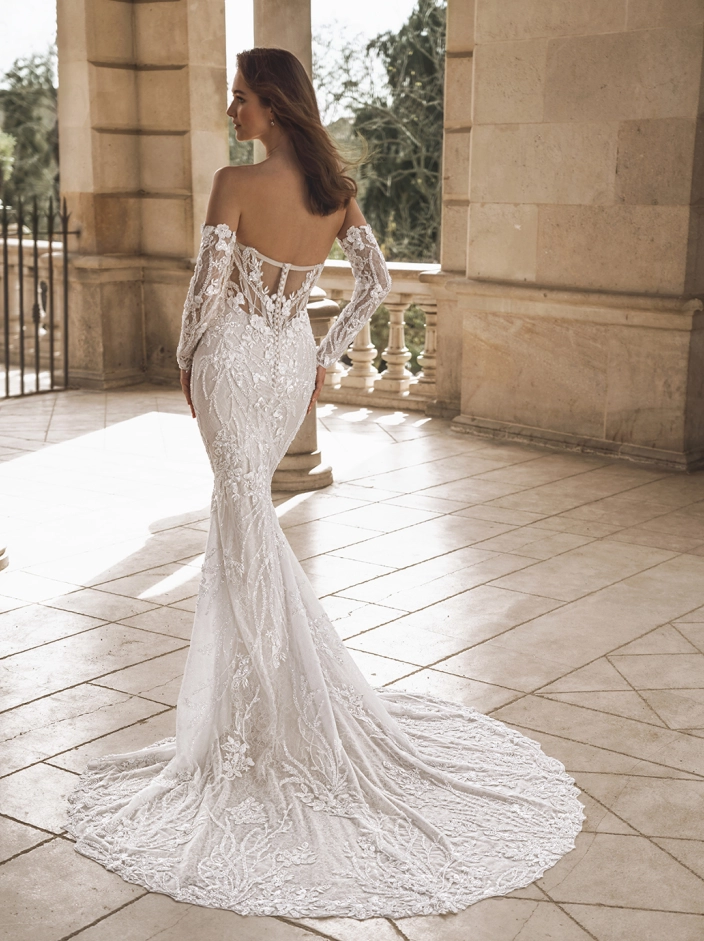 Introducing the ethereal FANTASIA bridal gown from Privé! This masterpiece seamlessly transitions from a voluminous ballgown to a sculptural fitted silhouette. Crafted from beaded vine lace and luxurious satin, its sweetheart neckline exudes dreamy romance. The detachable sleeves offer a playful twist, transforming this gown into a versatile 2-in-1 showstopper. With a touch of Hollywood glam, FANTASIA is a total stunner!