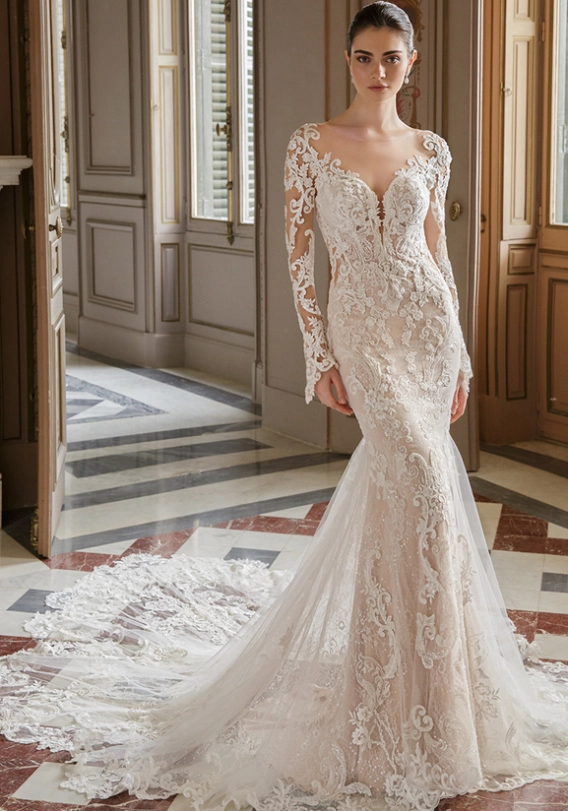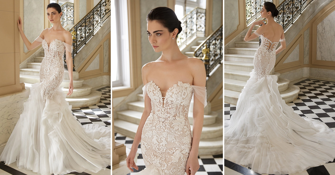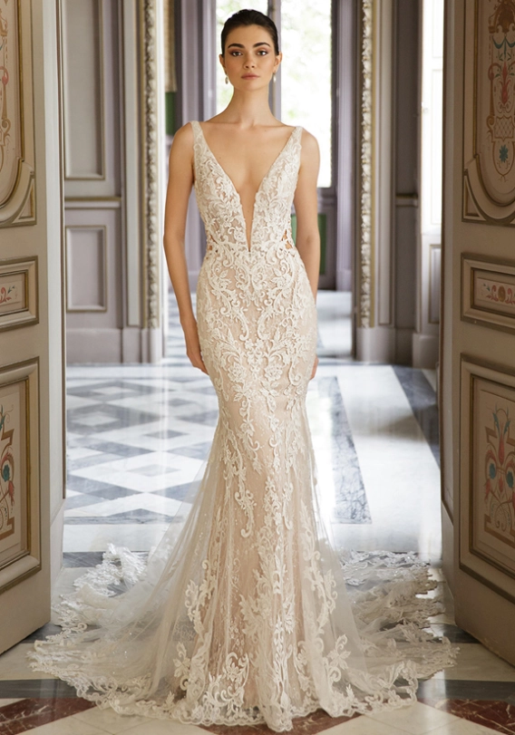 A new take on a classic mermaid silhouette – AALIYAH features a daring, plunging V-neckline with an illusion tulle inset for subtle coverage, along with a breathtaking low illusion back and illusion side cutouts.