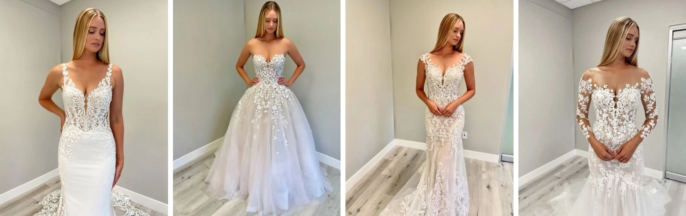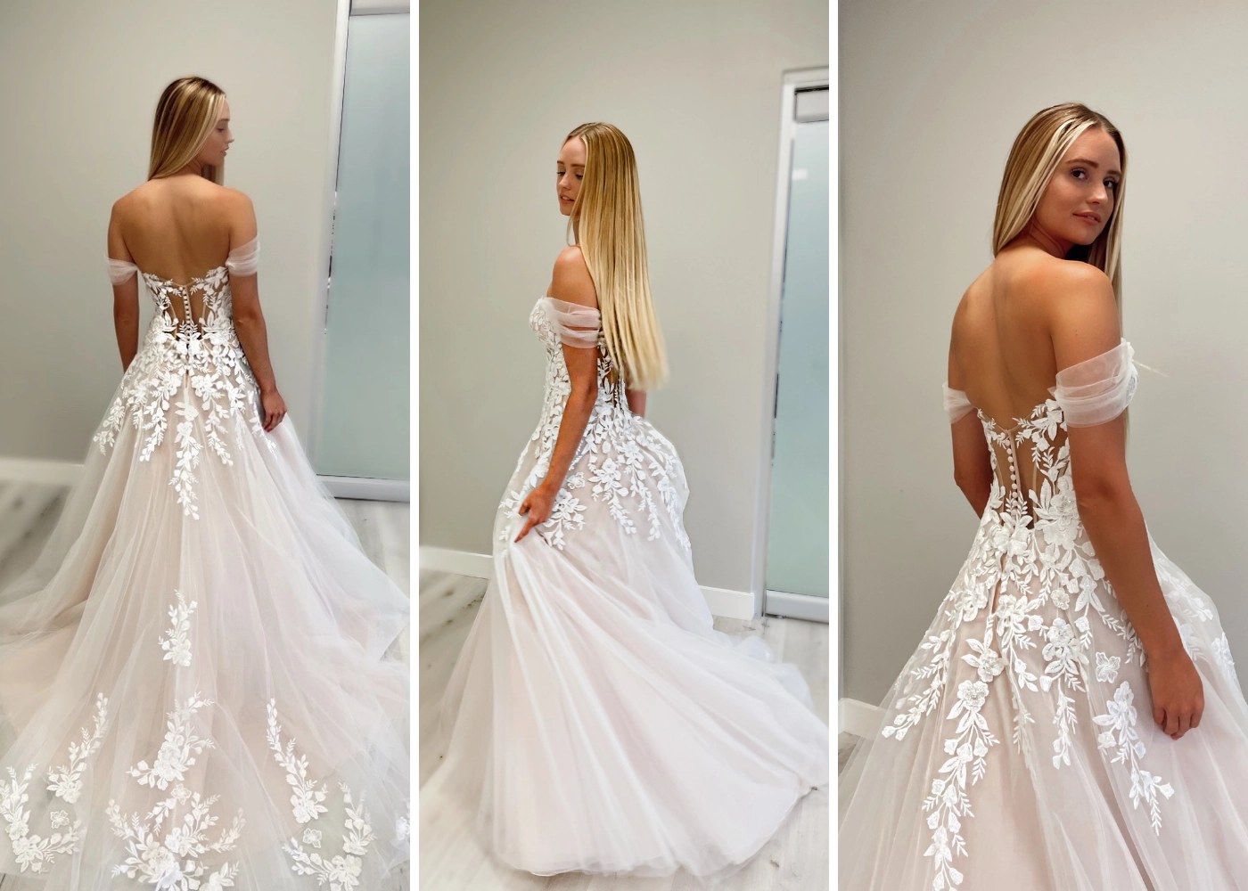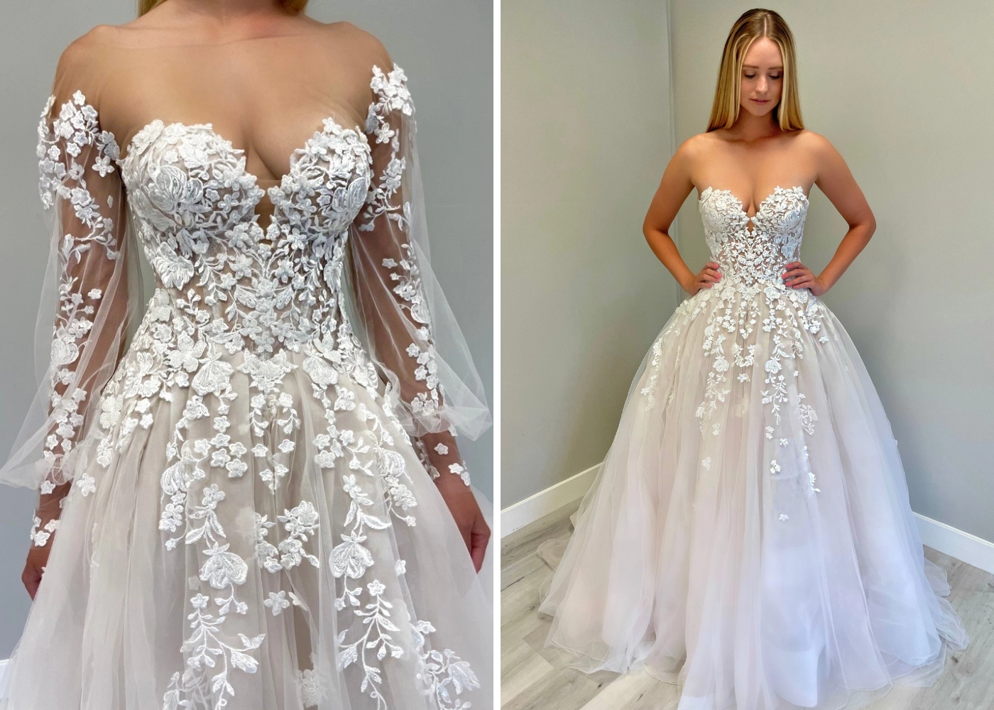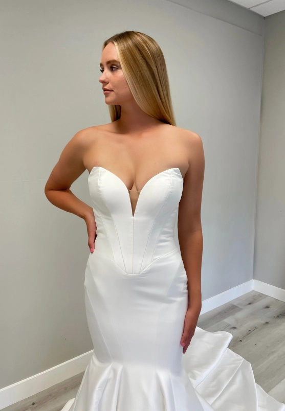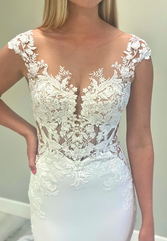 SIMONE is a guaranteed stunner as you walk down the aisle on your special day. She has an illusion, off-the-shoulder neckline that perfectly frames the deep sweetheart neckline.