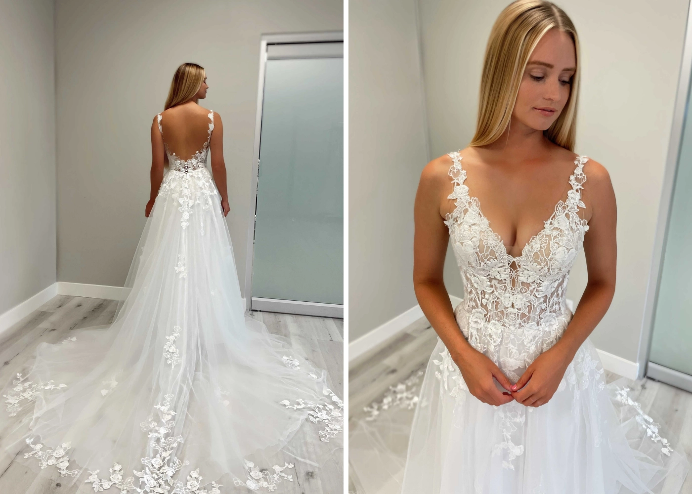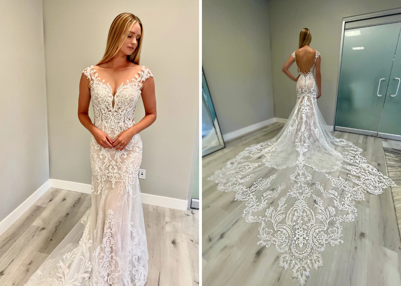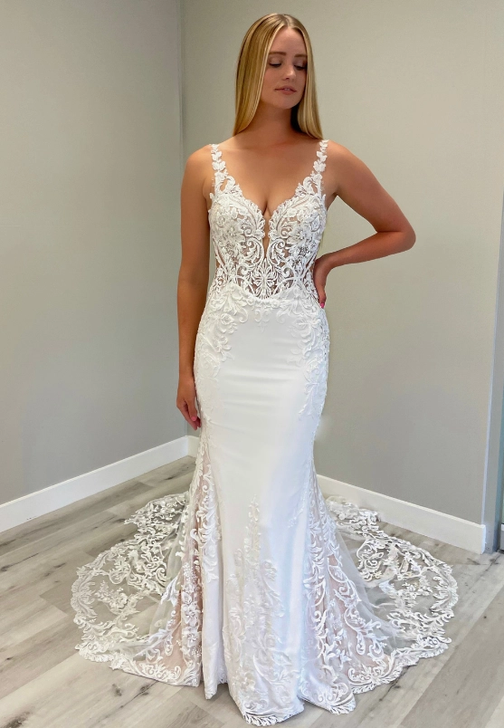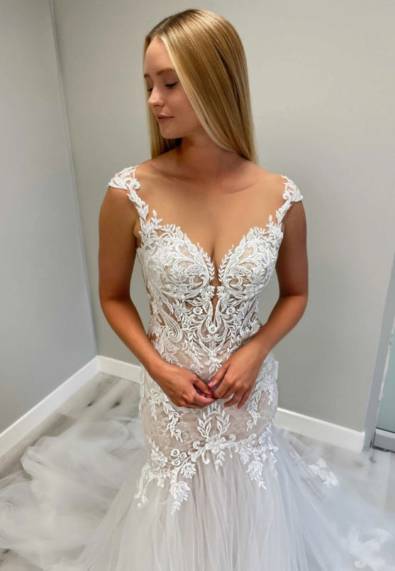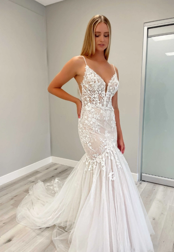This beautiful mermaid gown, ELIA, has a jaw-dropping V-neckline and body-contouring lace placement. The lace detailing all over the bodice and her tulle train will make everyone's heads turn!