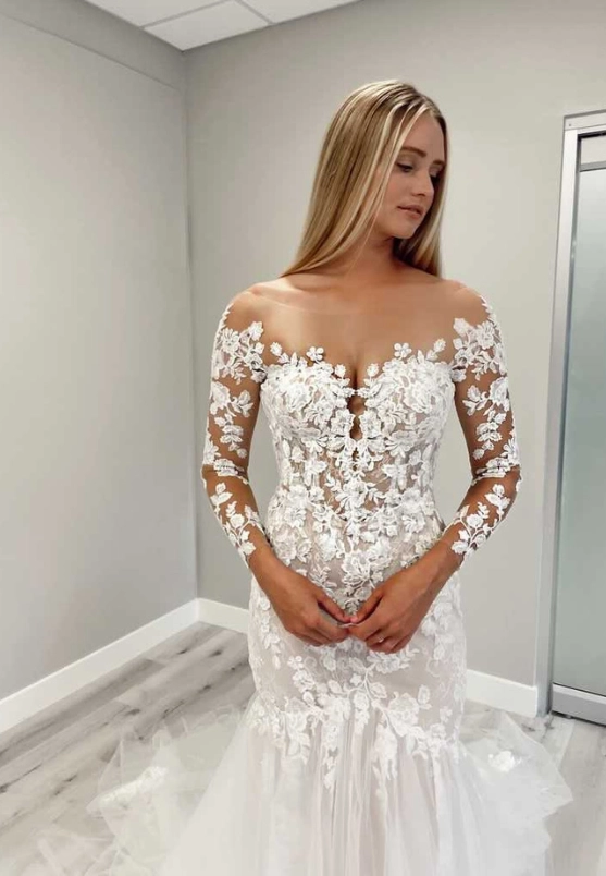ANNABELLE has the mermaid silhouette that we are always obsessing about. Her illusion neckline and sleeves make this gown super modern and romantic.