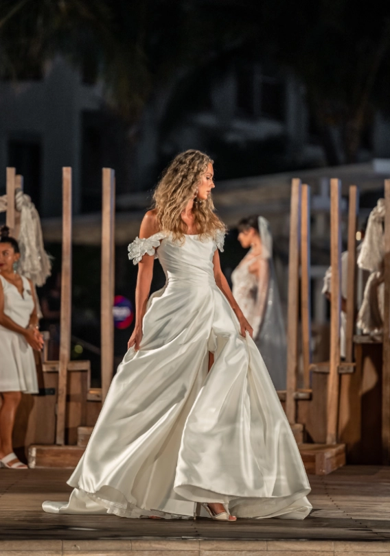 Twirling in TRIANON! She is a gorgeous Mikado A-line with a stunning sculpted neckline and detachable, 3D floral off-shoulder sleeves that give such a flattering look to any bride.