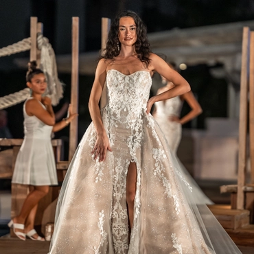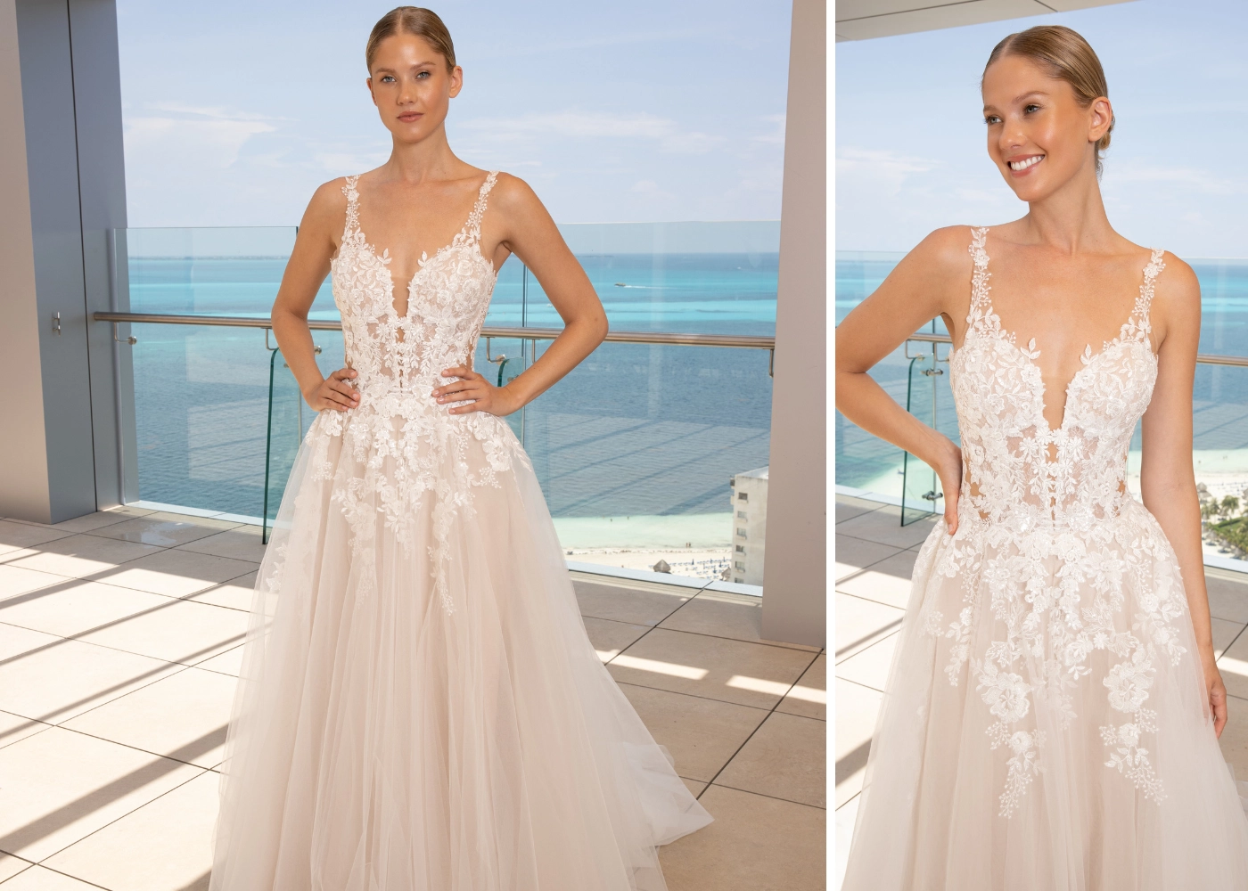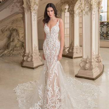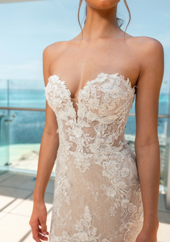 CELESTE is an effortlessly eye-catching gown with her sparkly lace and 3D floral details on the bodice for an ultra-romantic look. She's sexy, flirty and sure to grab everyone's attention.